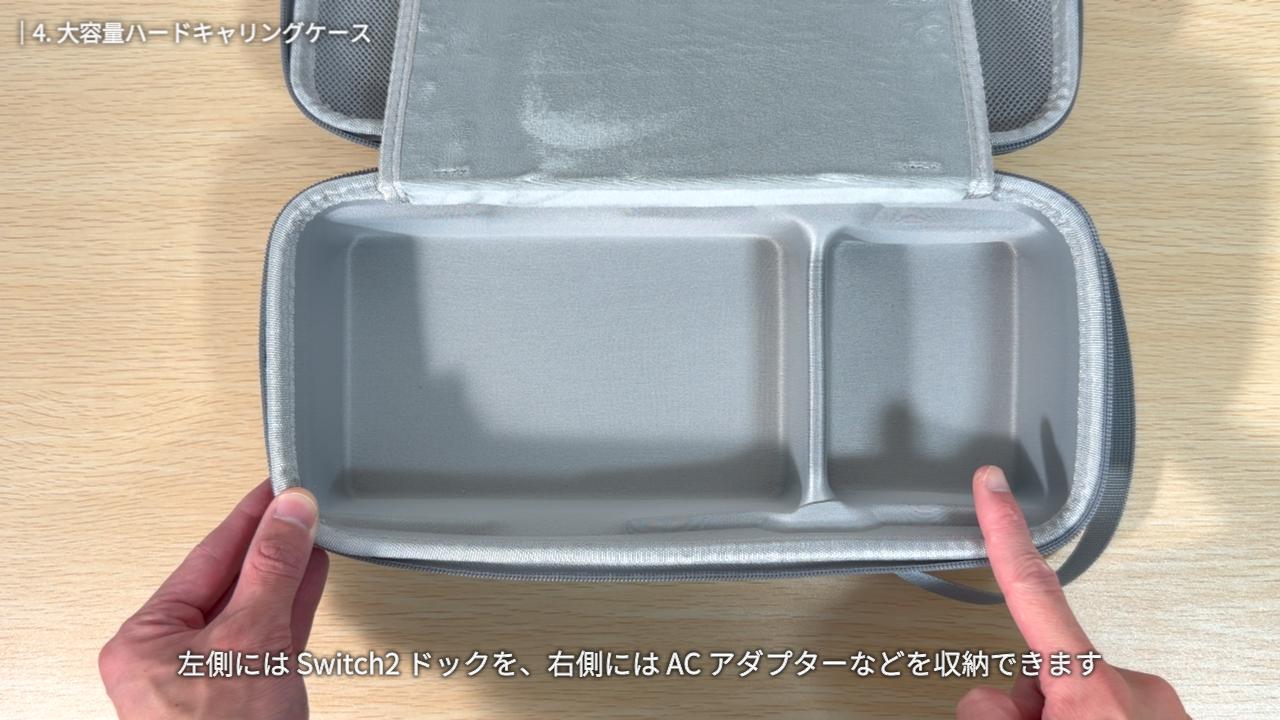 底面の収納部分は仕切りがあり、左側には Switch2 ドックを、右側にはACアダプターや充電ケーブルなどを収納できます。