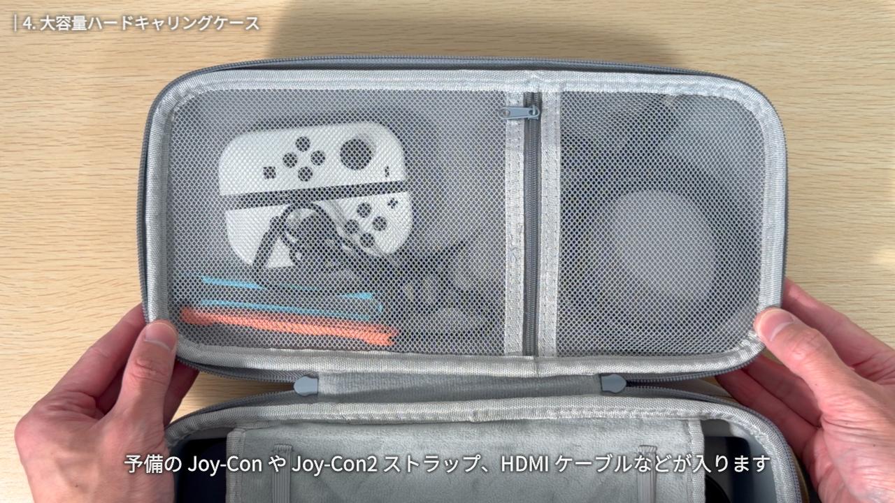 メッシュポケット部分には、厚みのない周辺機器を収納できます。予備のJoy-ConやJoy-Con2ストラップ、HDMIケーブルなどが入ります。
