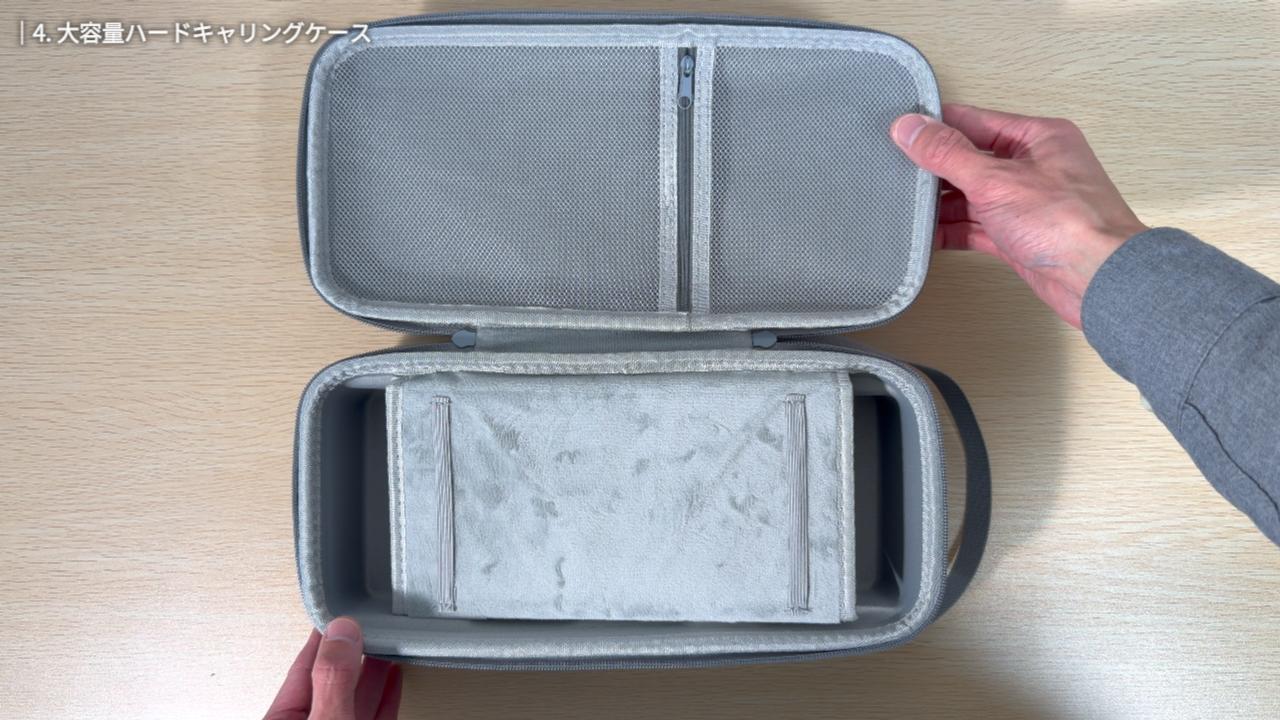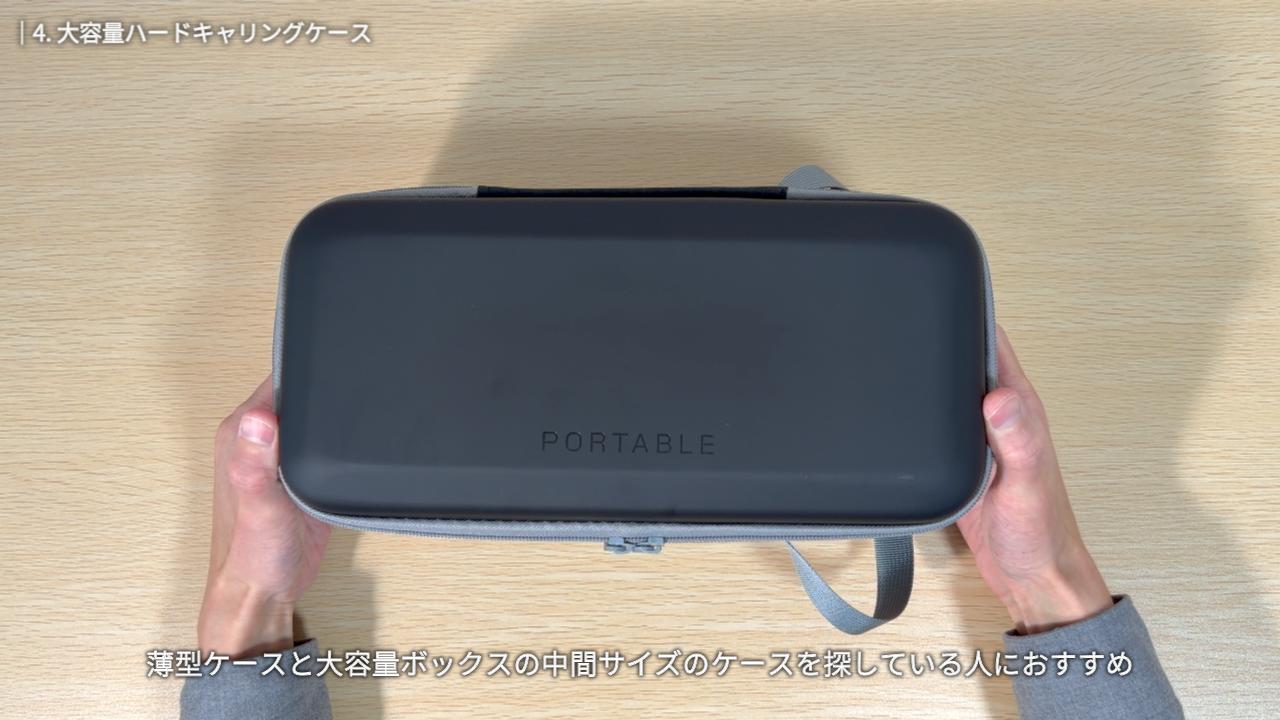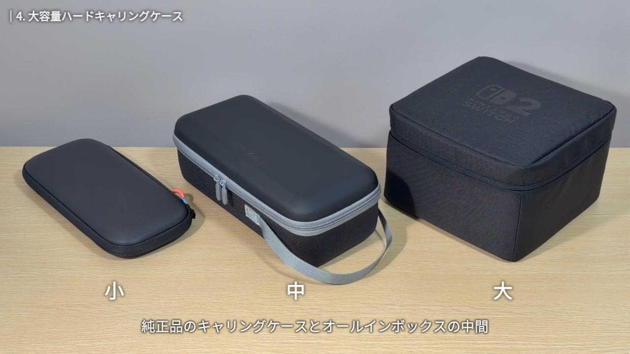 収納力としては、純正品のキャリングケースとオールインボックスの中間といったところですね。「周辺機器をまとめて持ち運びたいけど、オールインボックスほどの収納力は必要ない」という人には、満足できる容量だと思います。