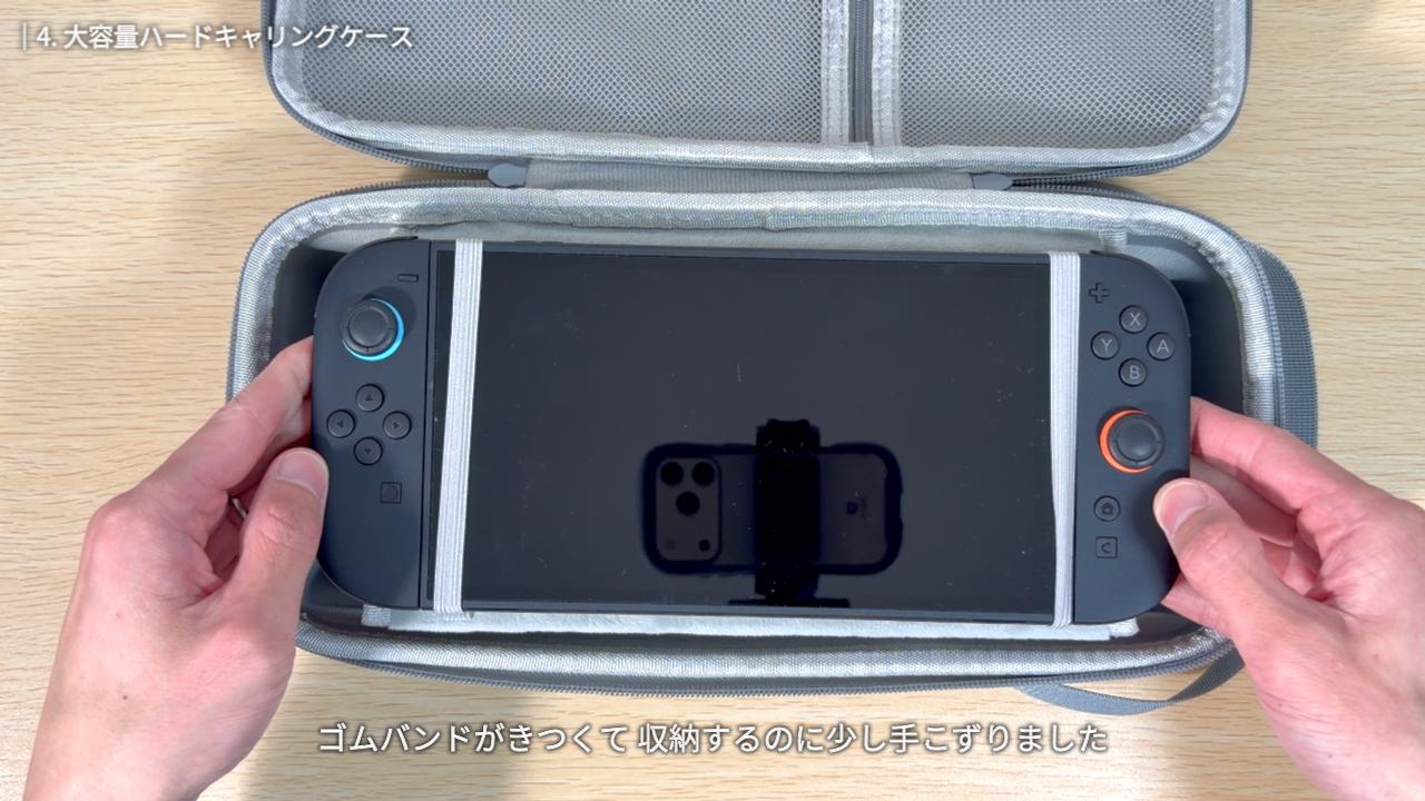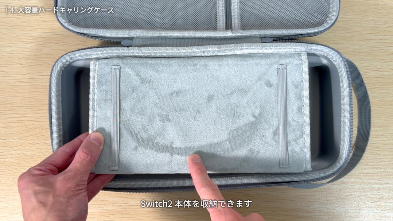 仕切りの部分には、Switch2 本体を収納できます。ゴムバンドでしっかり固定できる仕様です。