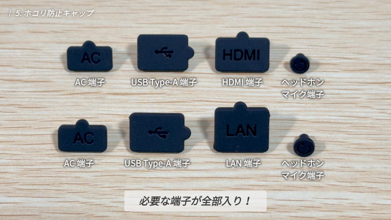 キャップの内容は、USB Type-A 用が 2 個、AC 端子用が 2 個、ヘッドホンマイク端子用が 2 個、さらに HDMI 端子用と LAN 端子用がそれぞれ 1 個ずつ入っています。