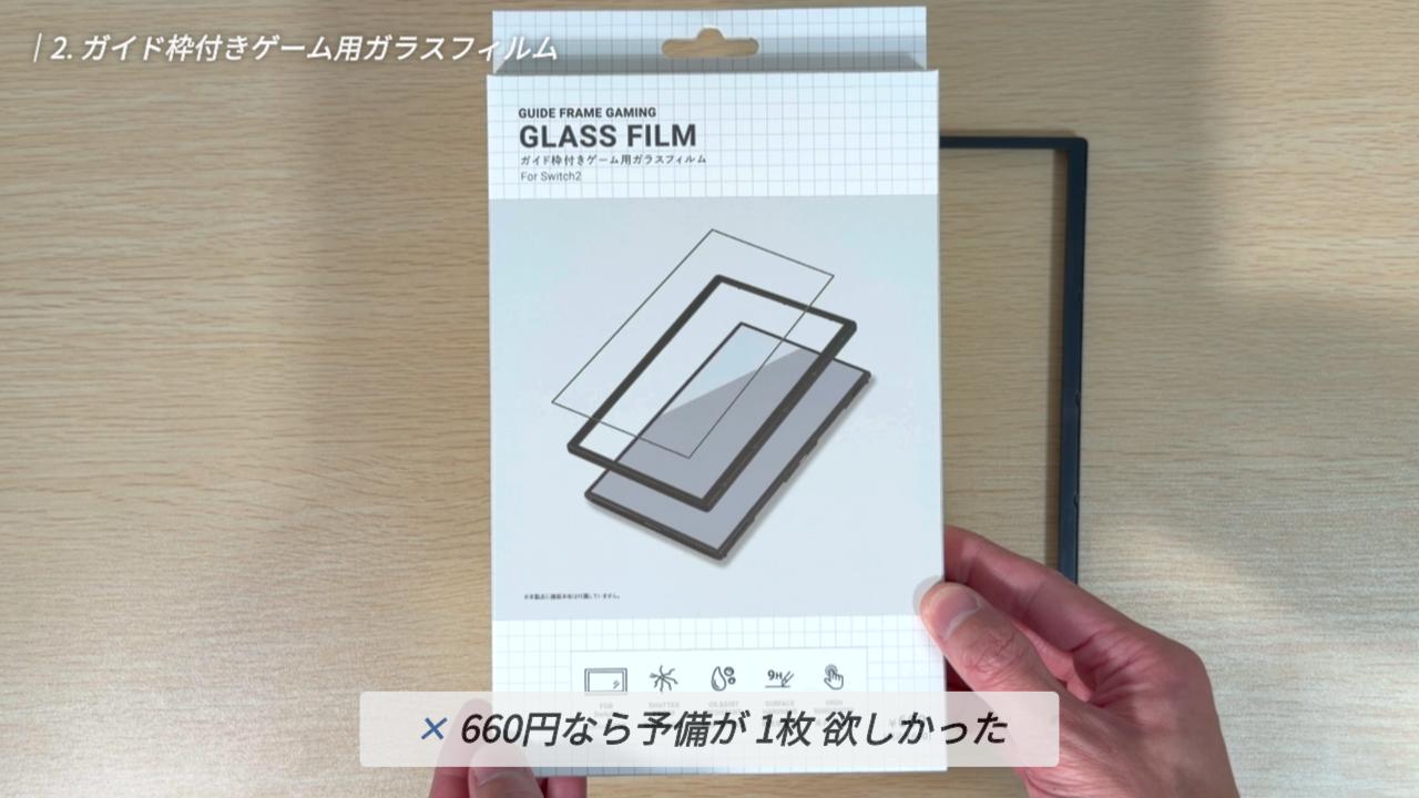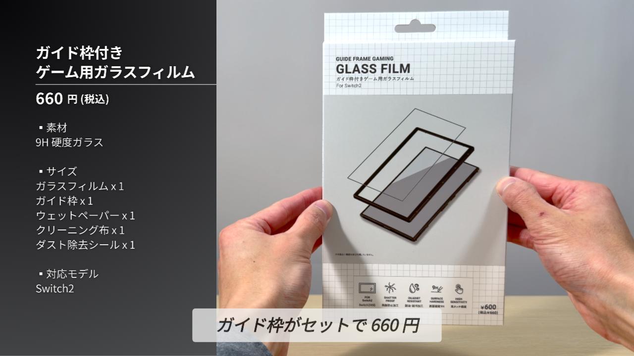 「ガイド枠付きゲーム用ガラスフィルム」は、Switch 2 の液晶画面をキズや汚れから守ってくれる保護フィルムと、貼り付け時に使用する「ガイド枠」がセットになった商品ですね。価格は660円となっています。