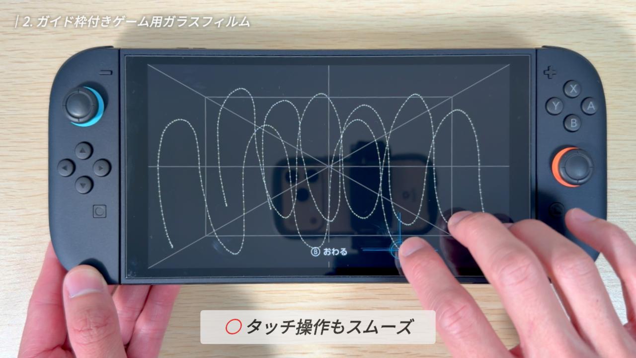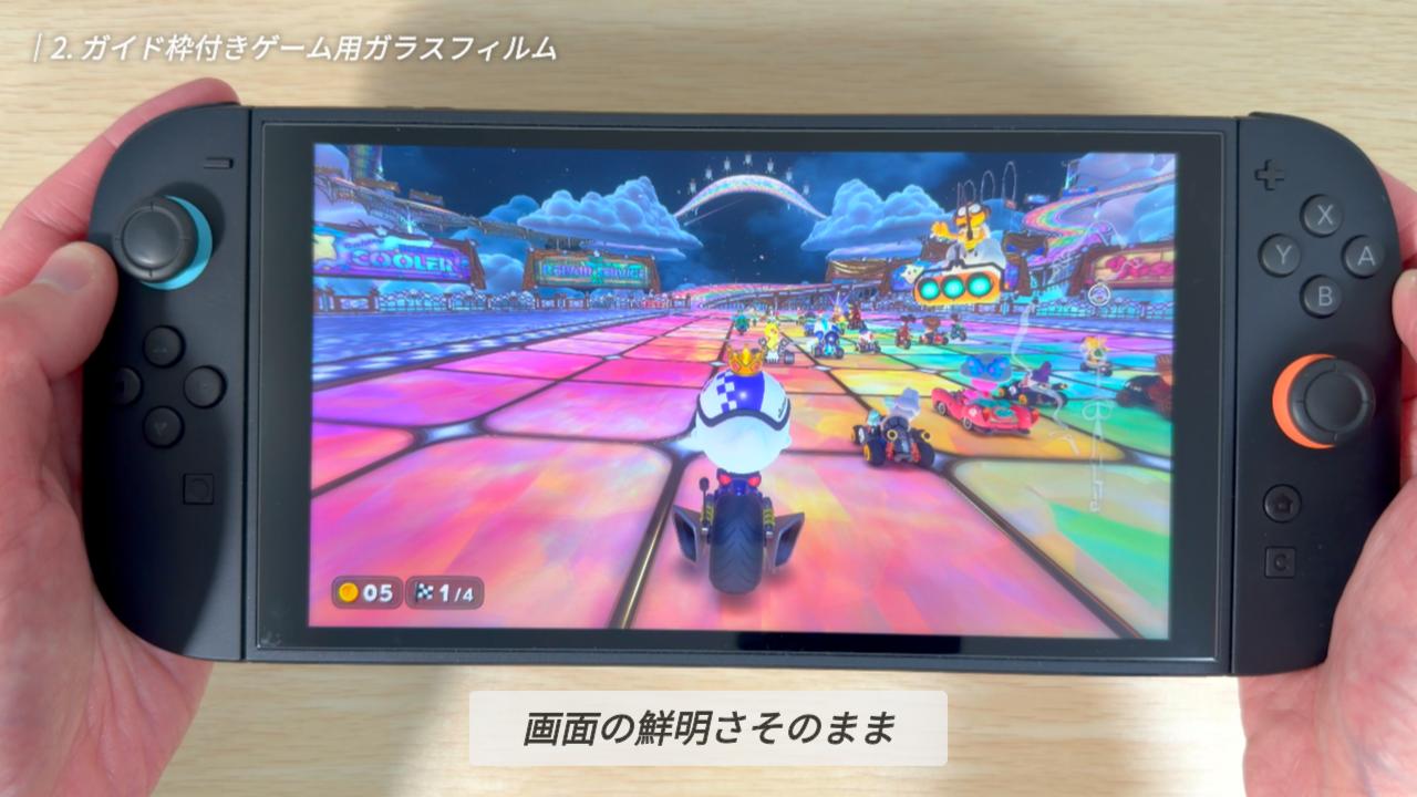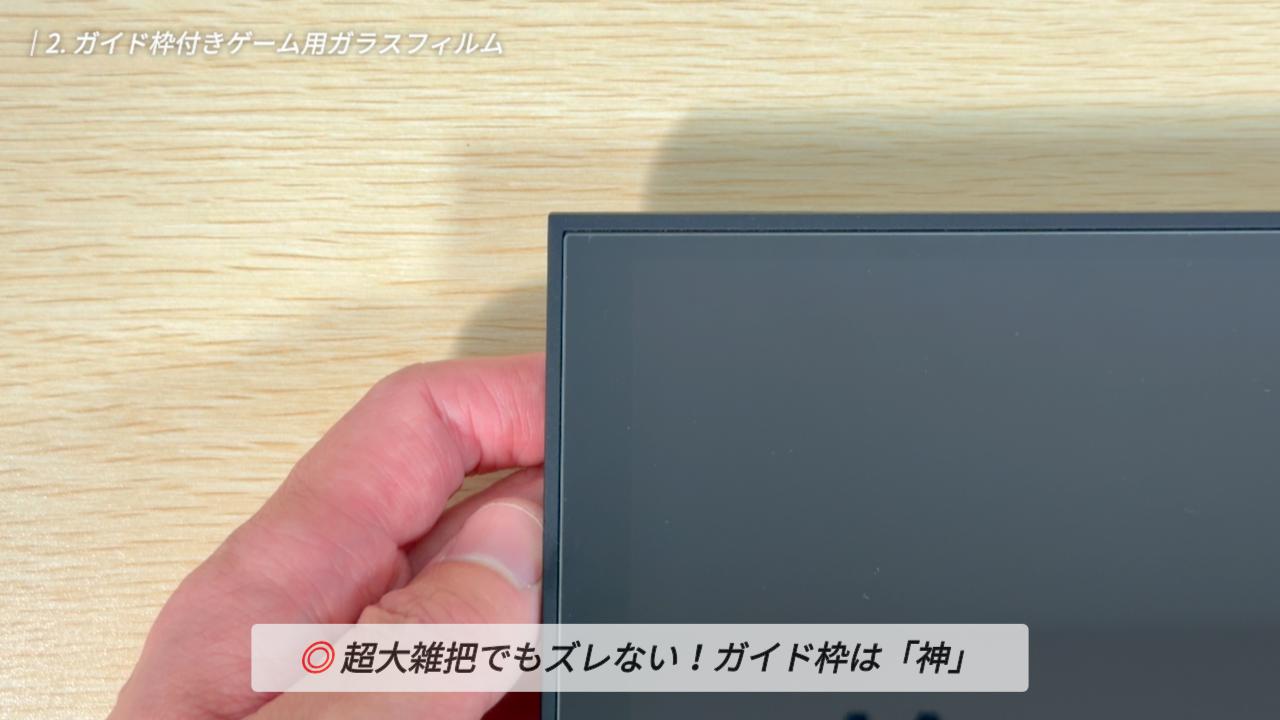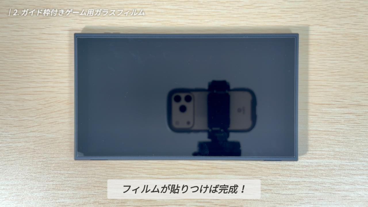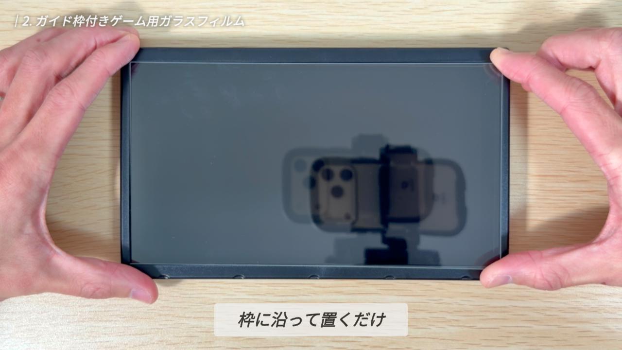今回はかなり大雑把に貼り付けてみたのですが、ガイド枠があったおかげで、位置がズレることは全くありませんでした。Switch 2 は画面サイズが大きく、手動だと位置合わせが難しいので、こうしたガイド枠の存在は本当にありがたいですね。