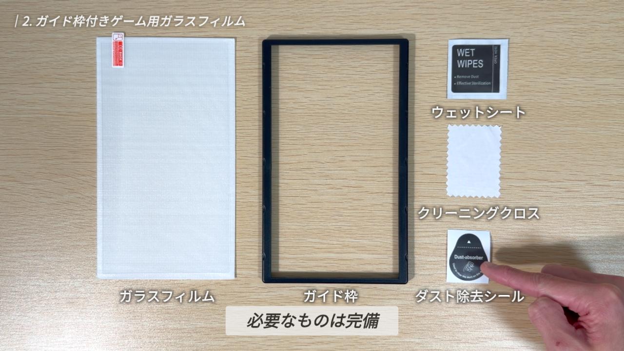 セット内容は、ガラスフィルム、ガイド枠、ウェットシート、クリーニングクロス、そしてダスト除去シールがそれぞれ 1 つずつ。必要なものはすべて揃っています。