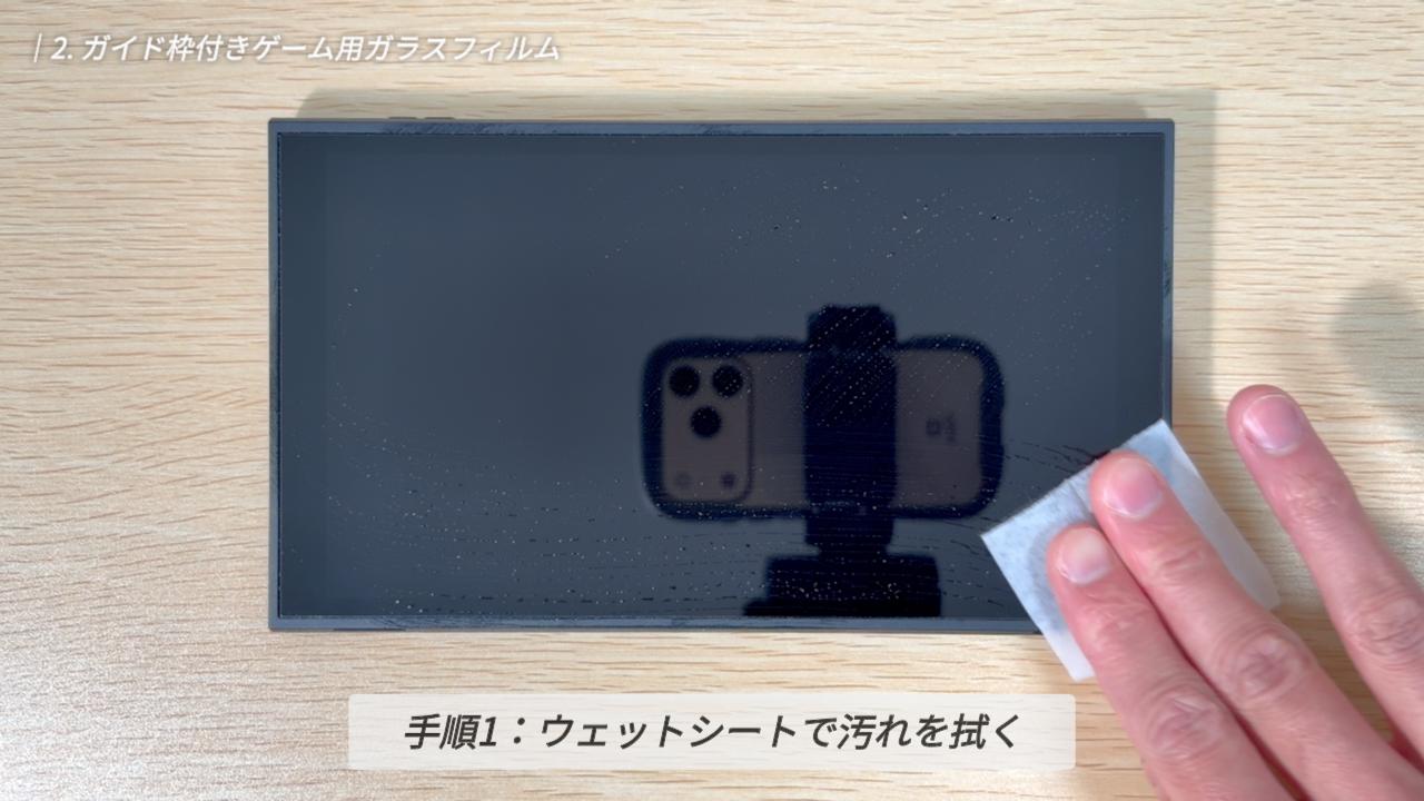 貼り付け方法はとても簡単です。まず、付属のウェットシートで画面の汚れを丁寧に拭き取ります。