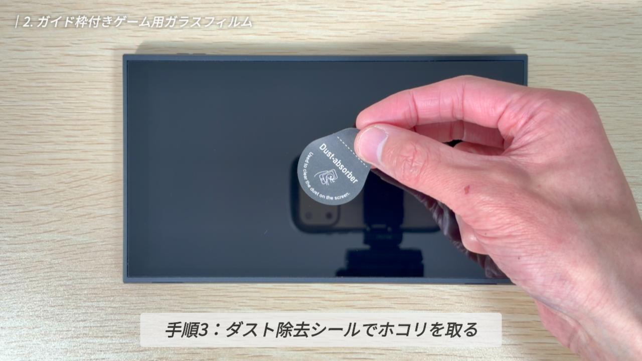 続いて、ダスト除去シールで、画面に残った細かなホコリを丁寧に取り除きます。