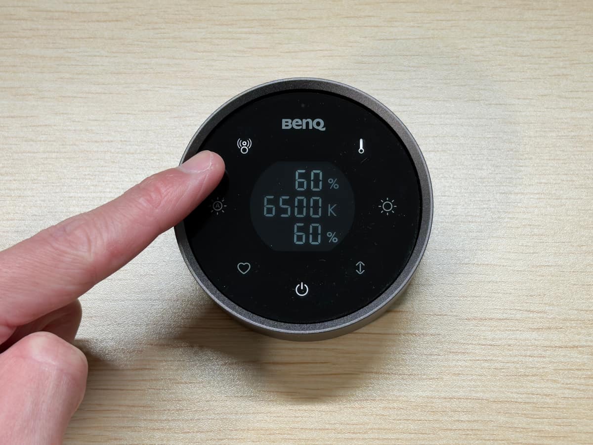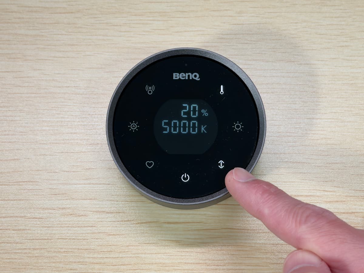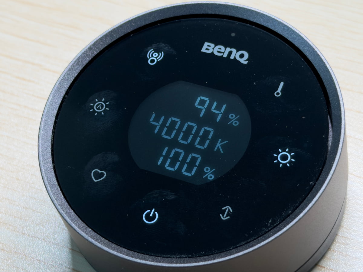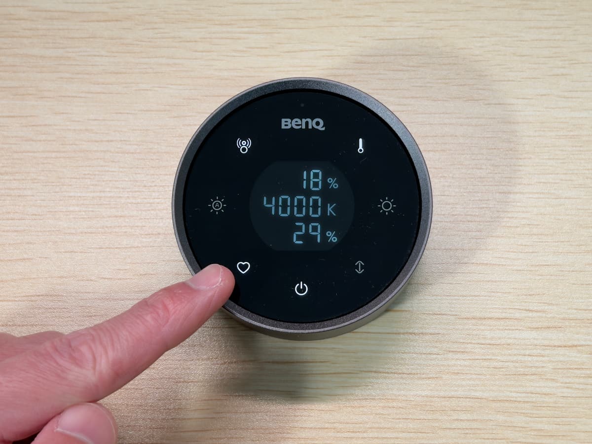 本体には約 15 度の傾斜ディスプレイが備わっており、使用時には中央に明るさや色温度といった各種パラメーターが数値で表示されます。