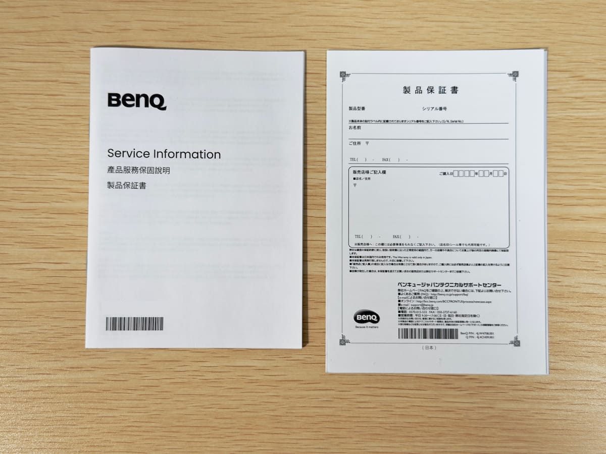 上写真に写っている 2 点は製品保証書。