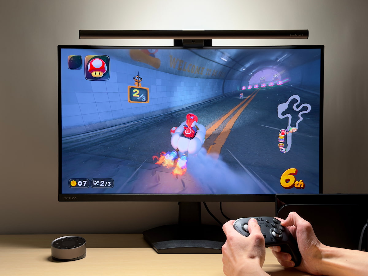 その悩みを解決するのが、BenQ のモニター掛け式 LED ライト「ScreenBar Halo 2」。モニター画面とその周囲を適切に明るく照らすことで、ゲームへの没入感を損なうことなく、目の負担を軽減してくれます。