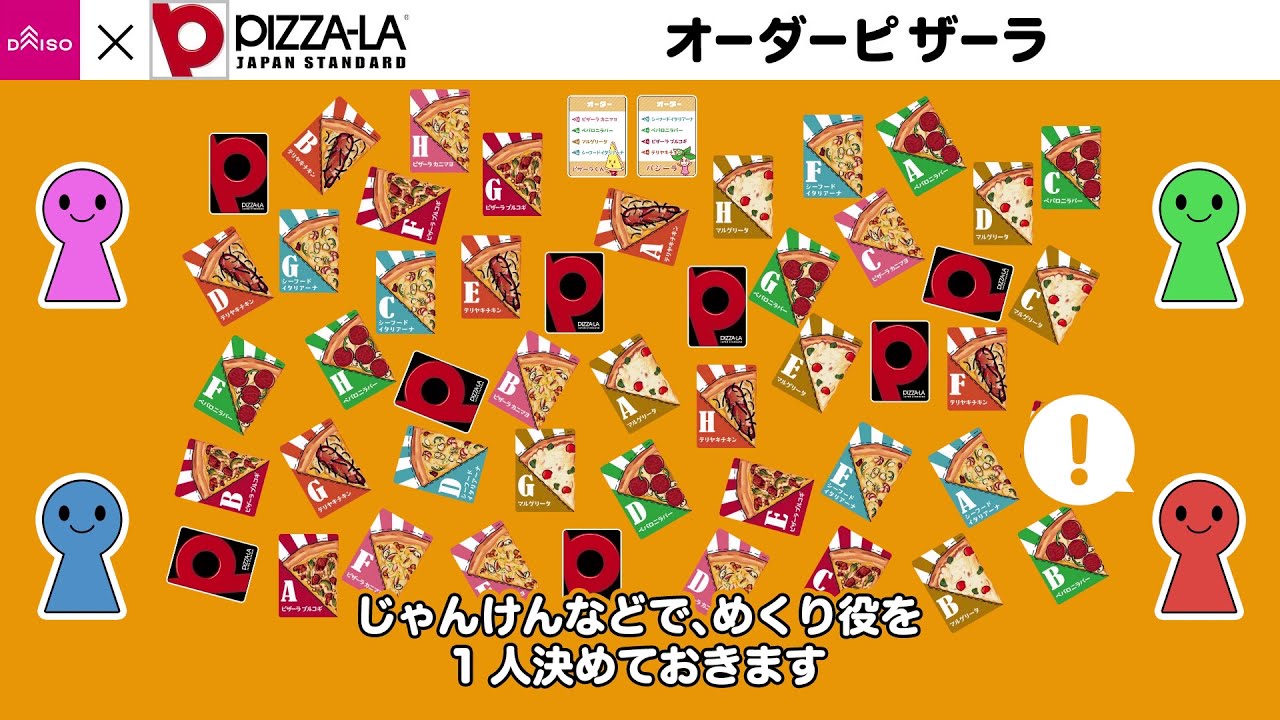 オーダーピザーラとは、100円ショップ「ダイソー」と宅配ピザチェーン「ピザーラ」がコラボしたボードゲーム。テーブルの上に並べられたピザカードを奪い合い、オーダーどおりにピザを完成させ、高得点を競うカードゲームです。