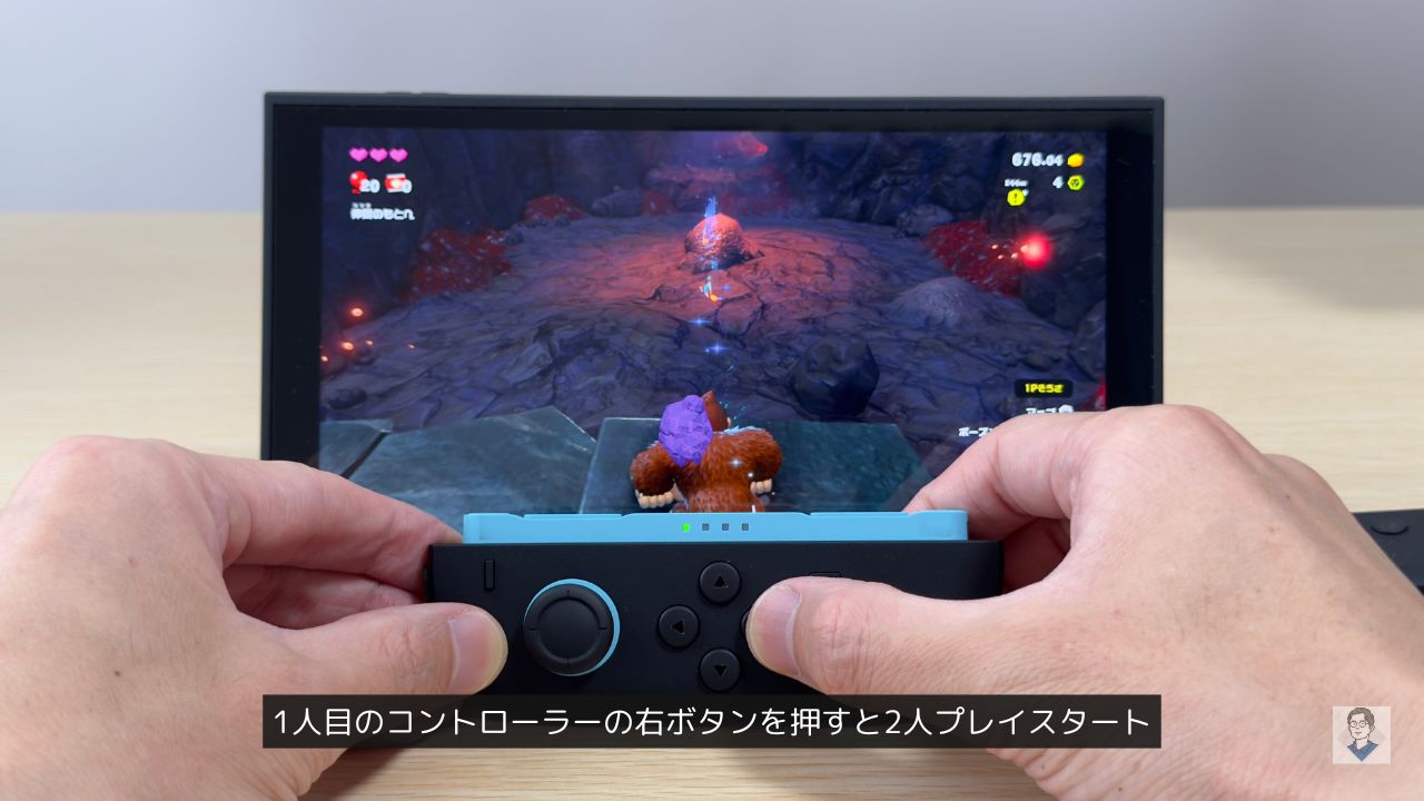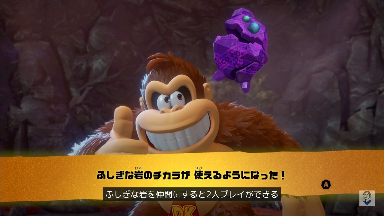 ちなみに、ゲーム開始時点で 2P のコントローラーを接続すると、主人公のドンキーコングを 1P と 2P のどちらでも操作することができます。