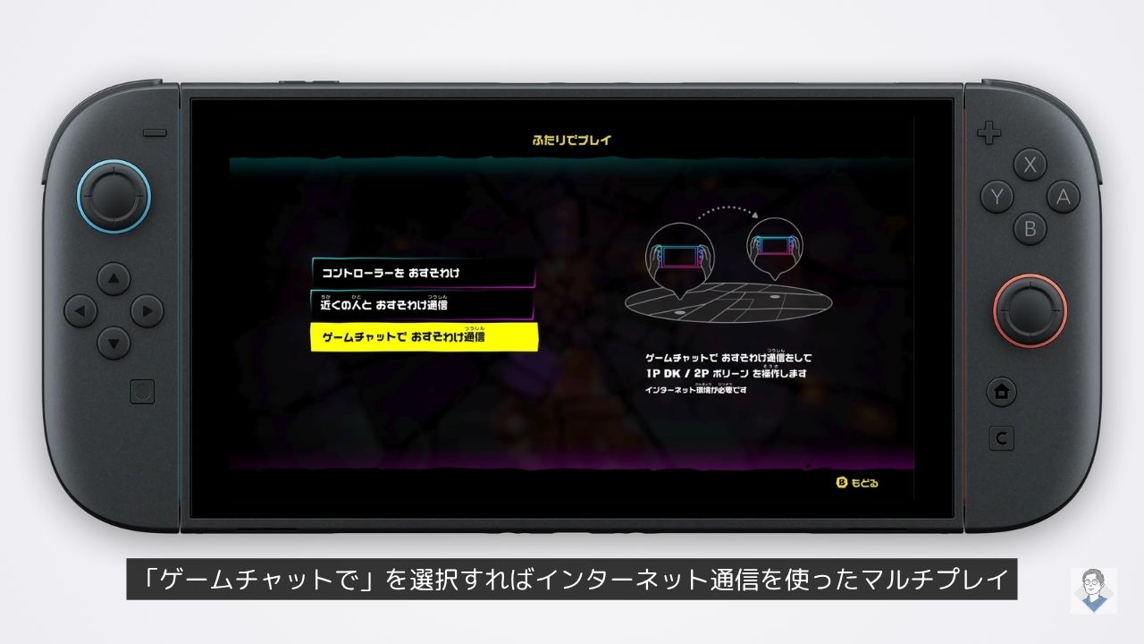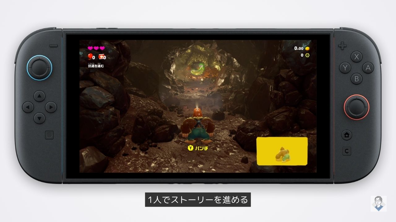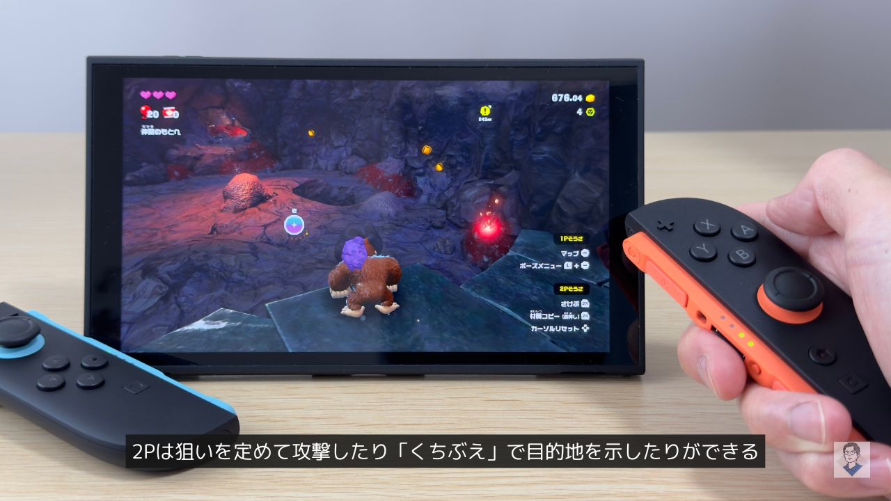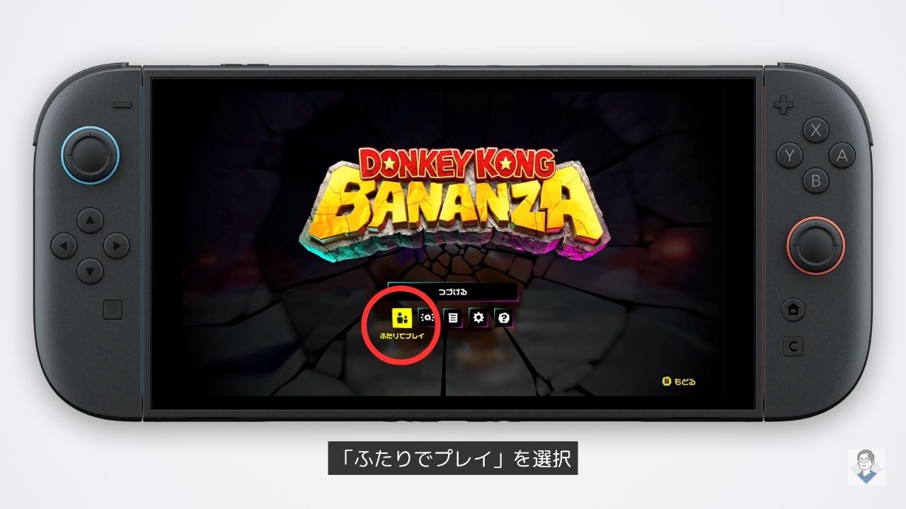 「ドンキーコングバナンザ」は、オフラインやオンラインで2人協力プレイができます。オフラインでは、Joy-Con2 のおすそわけプレイにも対応しています。