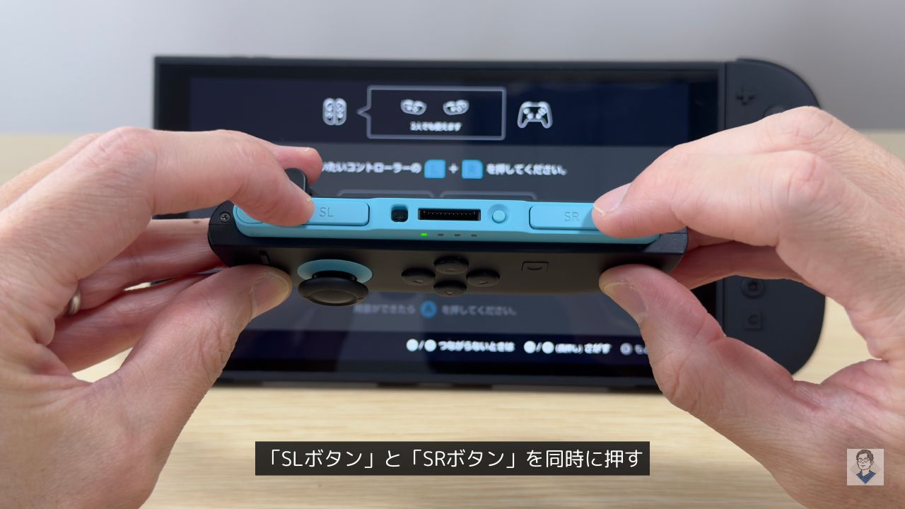 本体から外した Joy-Con2 は、本体に登録 済みのため、このまま「SLボタン」と「SRボタン」を同時に押せば、横持ちとして認識されます。