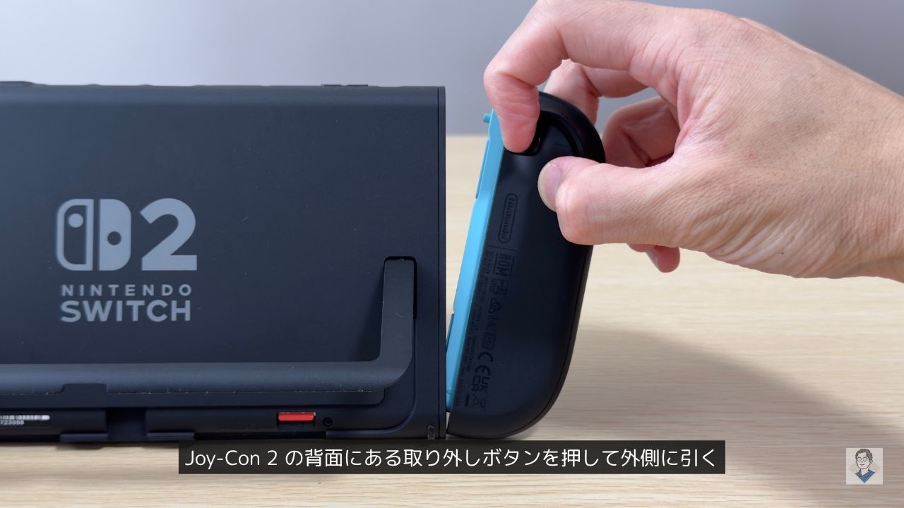 本体の片側をしっかり持った状態で、反対側の Joy-Con 2 の背面にある取り外しボタンを押して外側に引くと外れます。