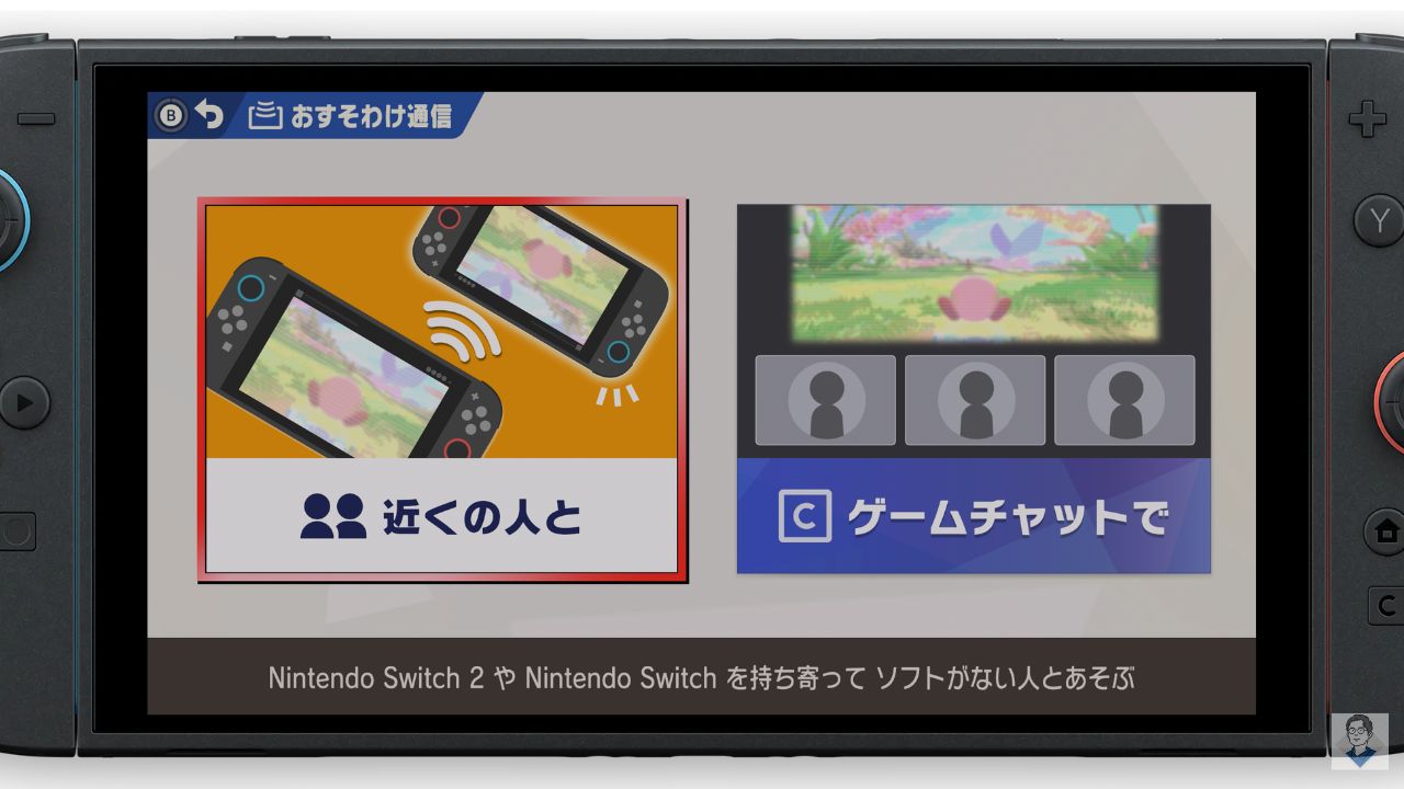 ゲームチャット中のメンバーにソフトをおすそわけする方法です。こちらはSwitch2専用の新機能となっており、利用にはオンライン(Nintendo Switch Online)への加入が必要です。
