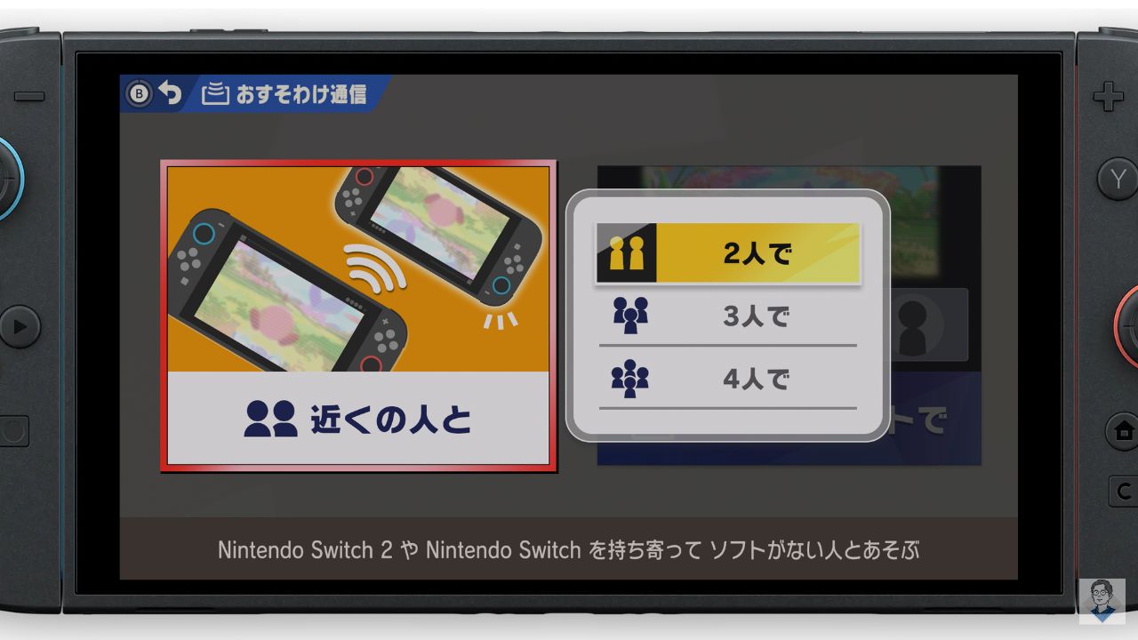 まずはソフトを持っている側の本体で、一緒に遊ぶ人数を選択しましょう。『カービィのエアライダー』では、最大3人にまでソフトをおすそわけすることが可能です。