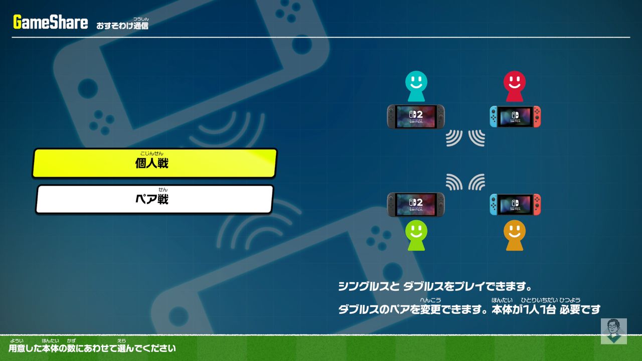 ペア戦: ダブルスのみプレイできます。1台の本体から最大2人まで参加可能です。