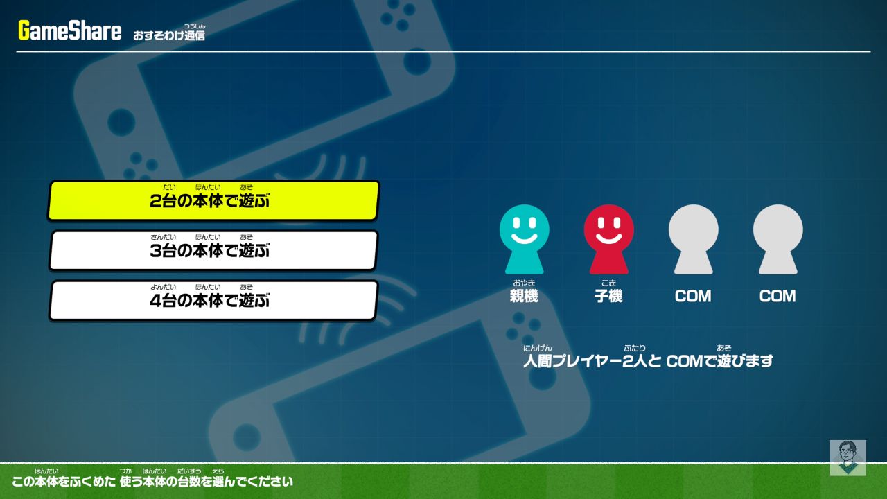 | おすそわけプレイ | 対応(Joy-Con 1 本ずつで OK) |