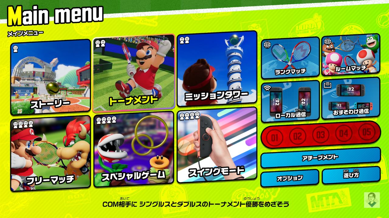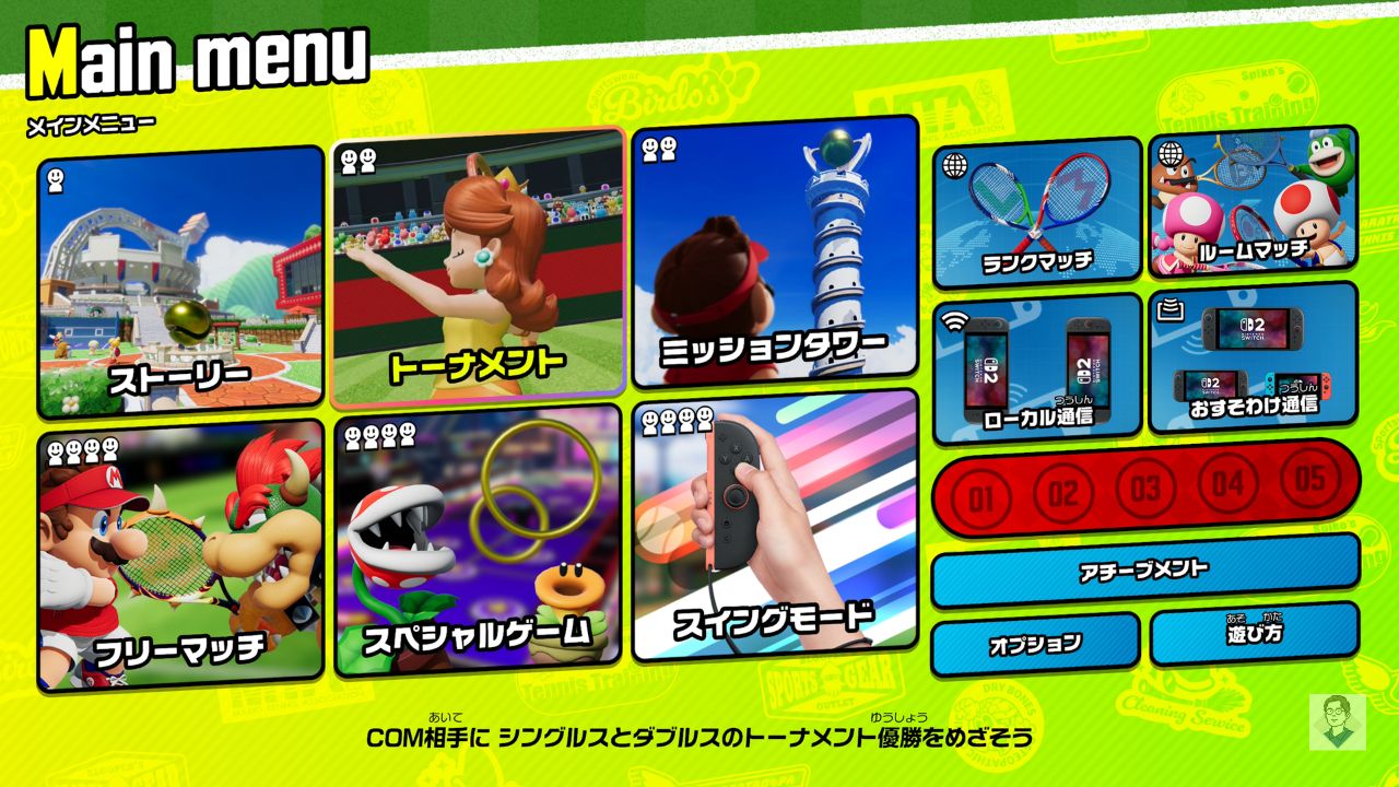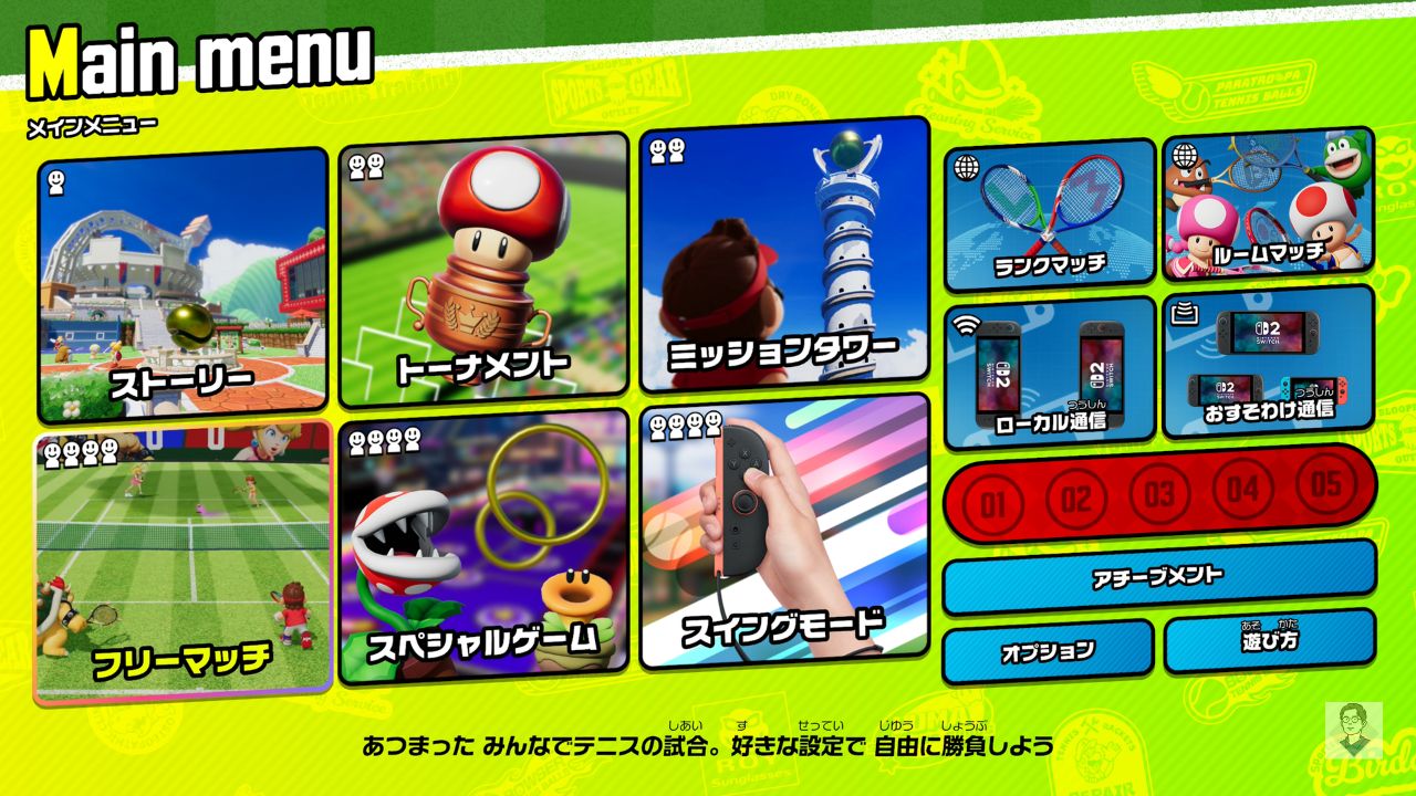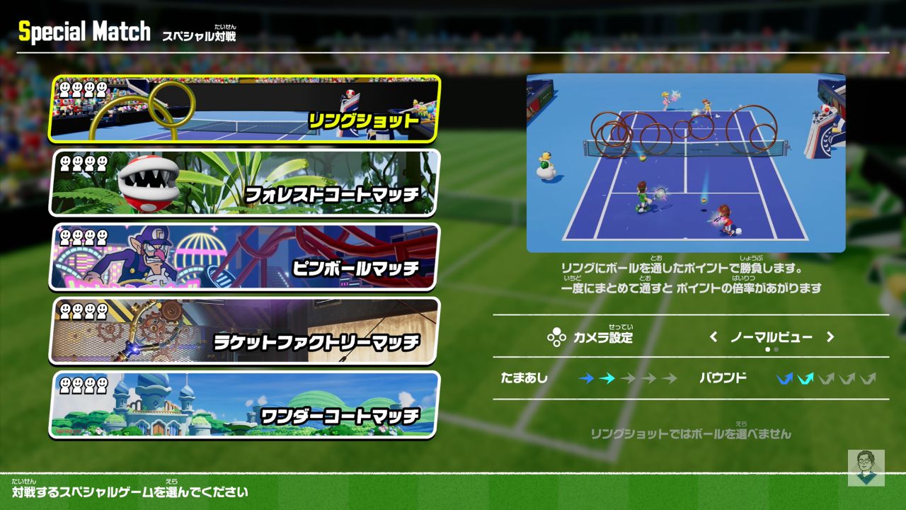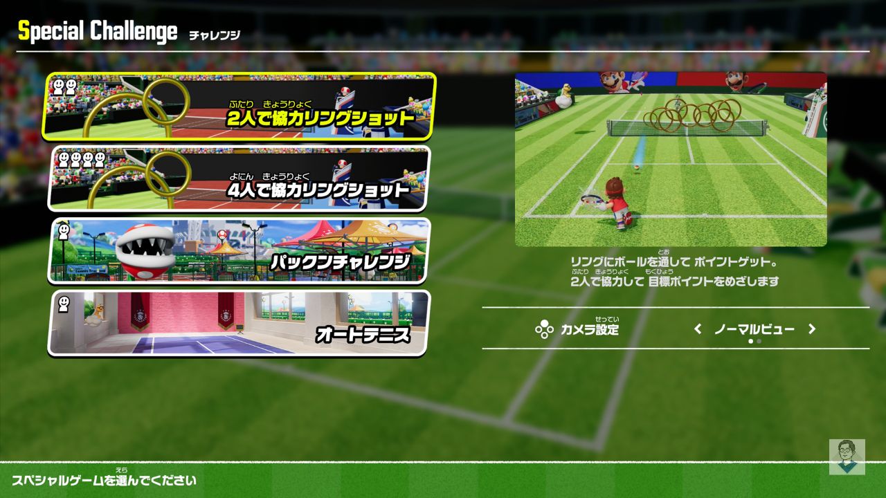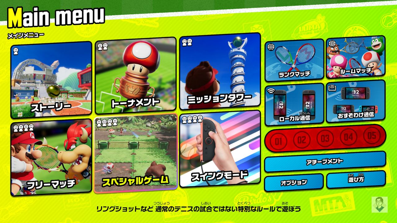 スペシャル対戦(対戦・協力): 普通のテニスコートとは違い、ボールの動きを邪魔する障害物が出現したり、ショットに制限がかかったりと、「一筋縄ではいかない対戦」が繰り広げられます。「シングルス」と「ダブルス」から選ぶことができ、最大4人での対戦・協力プレイが楽しめます。