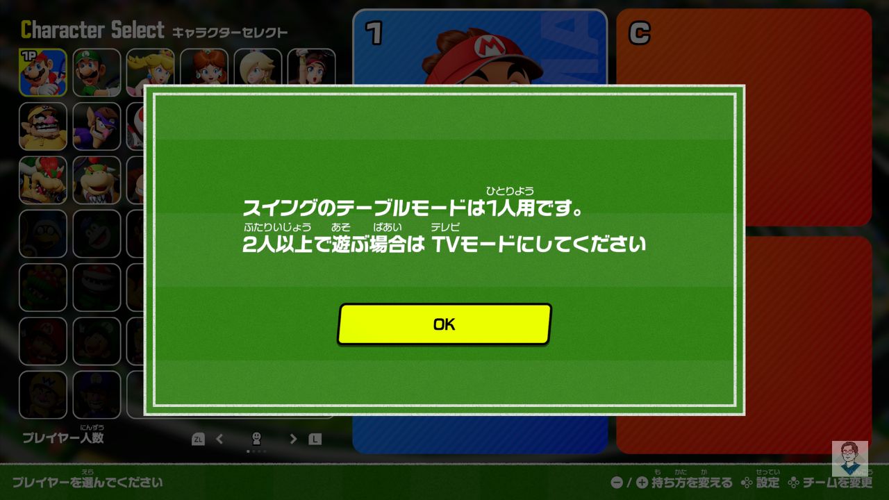 プレイ環境の制約: 2人以上で遊ぶ場合はTVモード限定。テーブルモードで2人以上を選択すると、「スイングのテーブルモードは1人用です。2人以上で遊ぶ場合はTVモードにしてください」という警告が表示され、進行不可となります。
