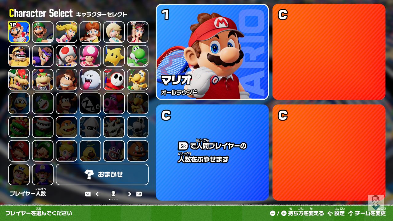プレイヤーの参加可能人数は画面左下に表示されています。1P(ホスト)が「L / R」または「SL / SR」ボタンを押して、参加枠(スロット)を増やして調整しましょう。