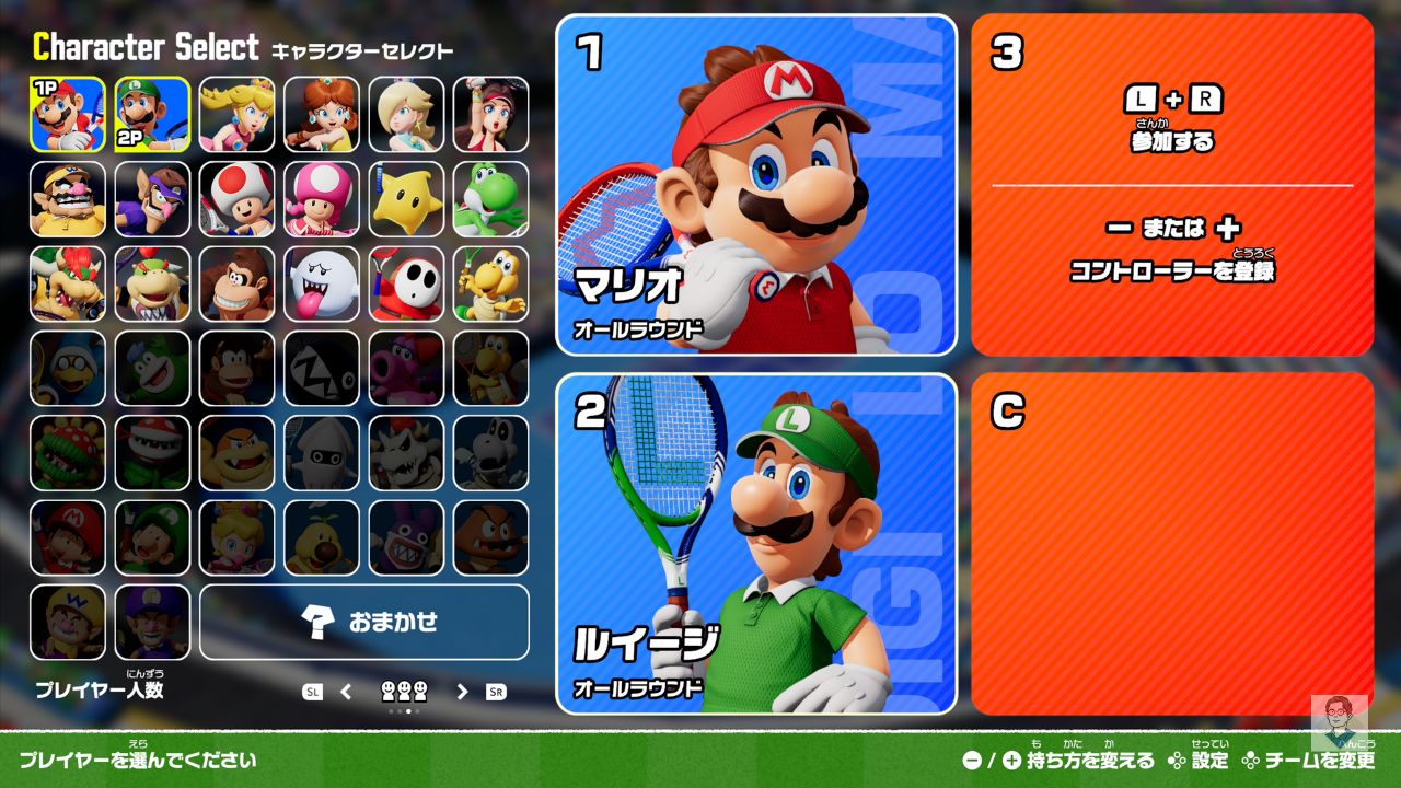 このキャラクター選択画面で、コントローラーの登録を行います。 新しく参加するプレイヤーは、自分のコントローラーの「-(マイナス)」または「+(プラス)」ボタンを押して登録画面を呼び出し、「L / R」または「SL / SR」ボタンを押して参加を確定させてください。