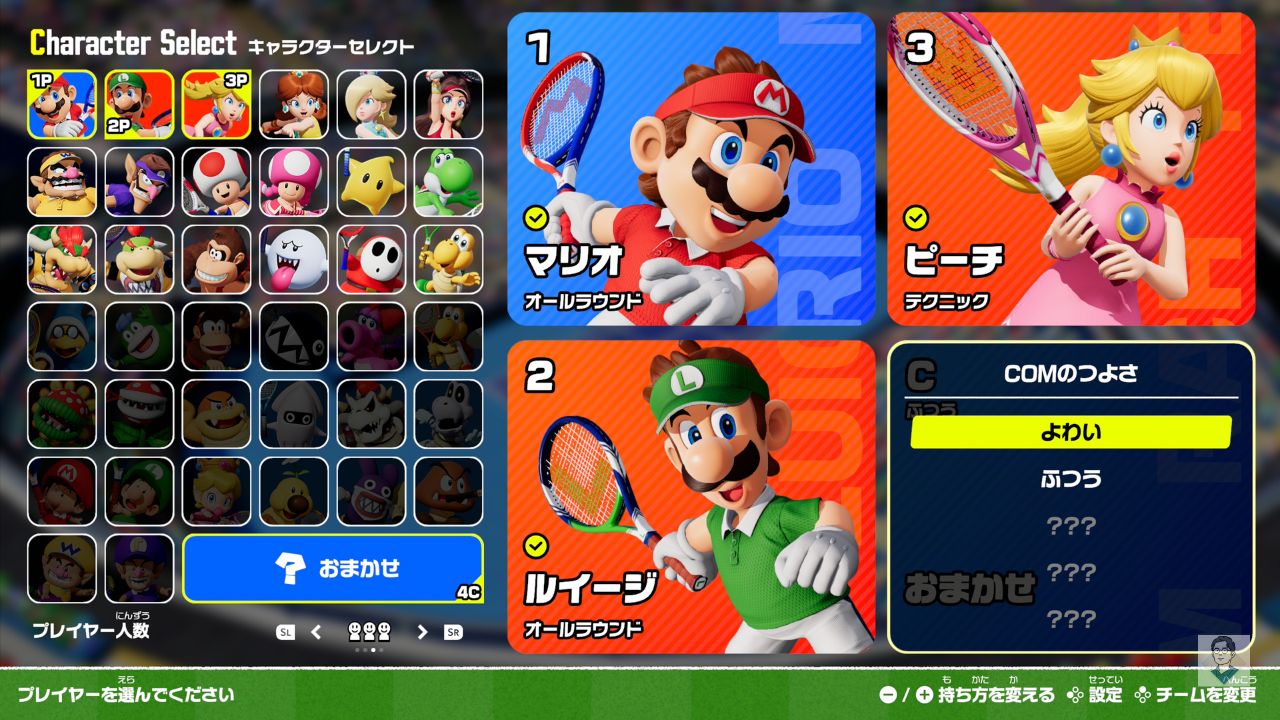 CPUを混ぜて遊ぶ場合は、強さを調整できます。 キャラクターを選択した後に、5段階から強さを選べます。