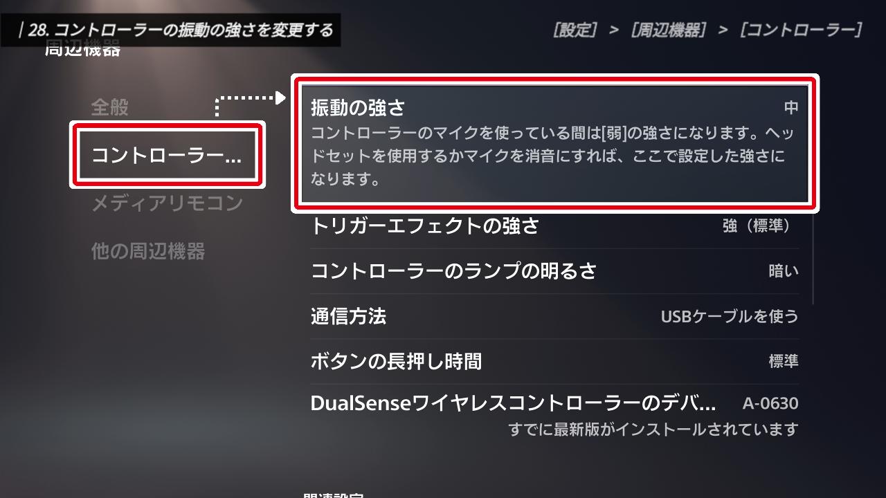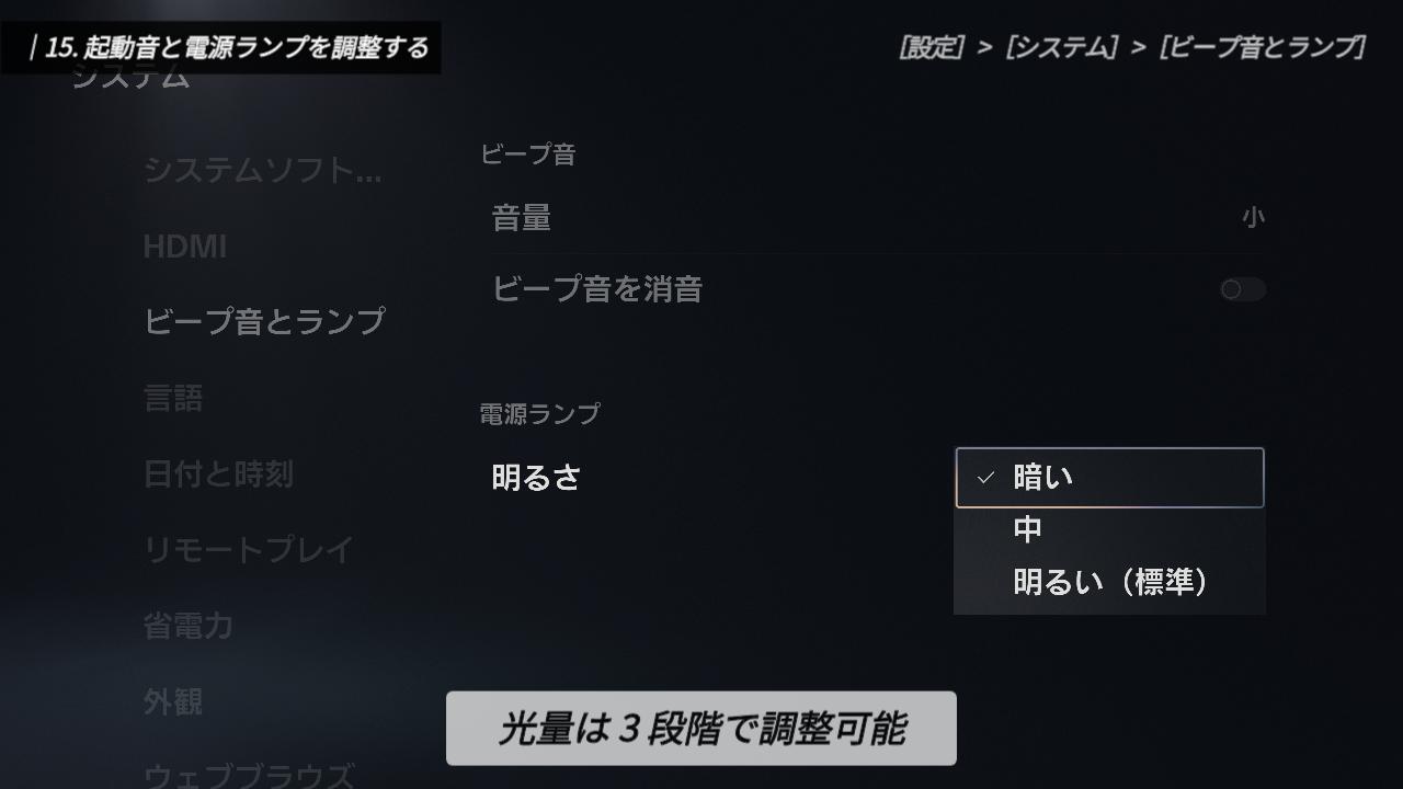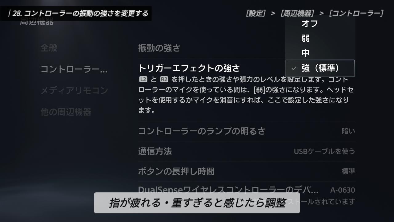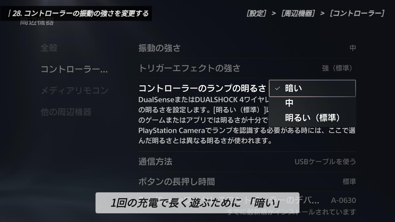 正直なところ、このランプが明るくてもプレイ上のメリットは少なく、むしろバッテリーを無駄に消費してしまいます。少しでもコントローラーを長持ちさせるために、「暗い」に設定しておくのが個人的なおすすめです。