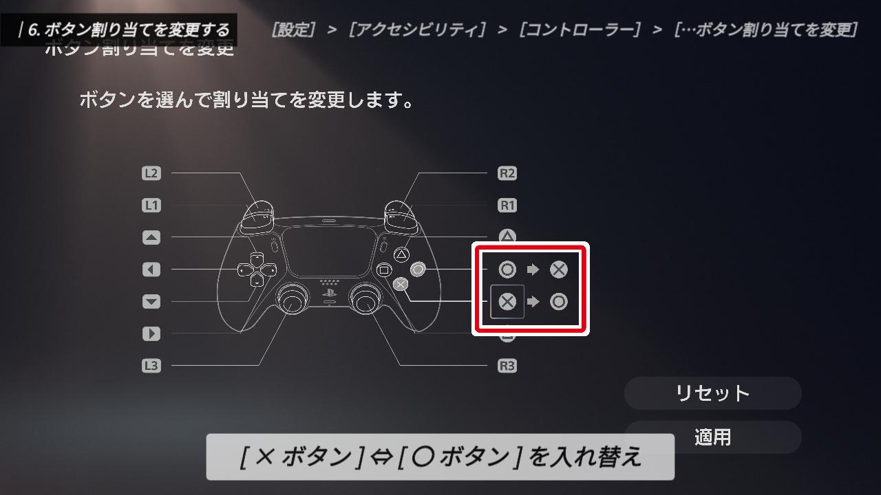 編集画面に切り替わったら、「×ボタン」と「〇ボタン」を入れ替えれば設定完了です。