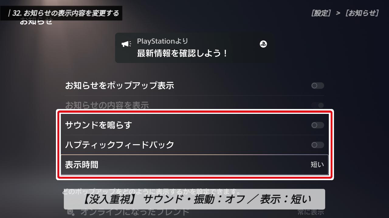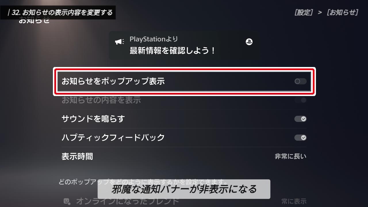 「プレイ中にお知らせが出ると、気が散って集中できない」という方は、一番上の「お知らせをポップアップ表示」をオフにしましょう。これで、画面上に通知バナーが表示されることはなくなります。
