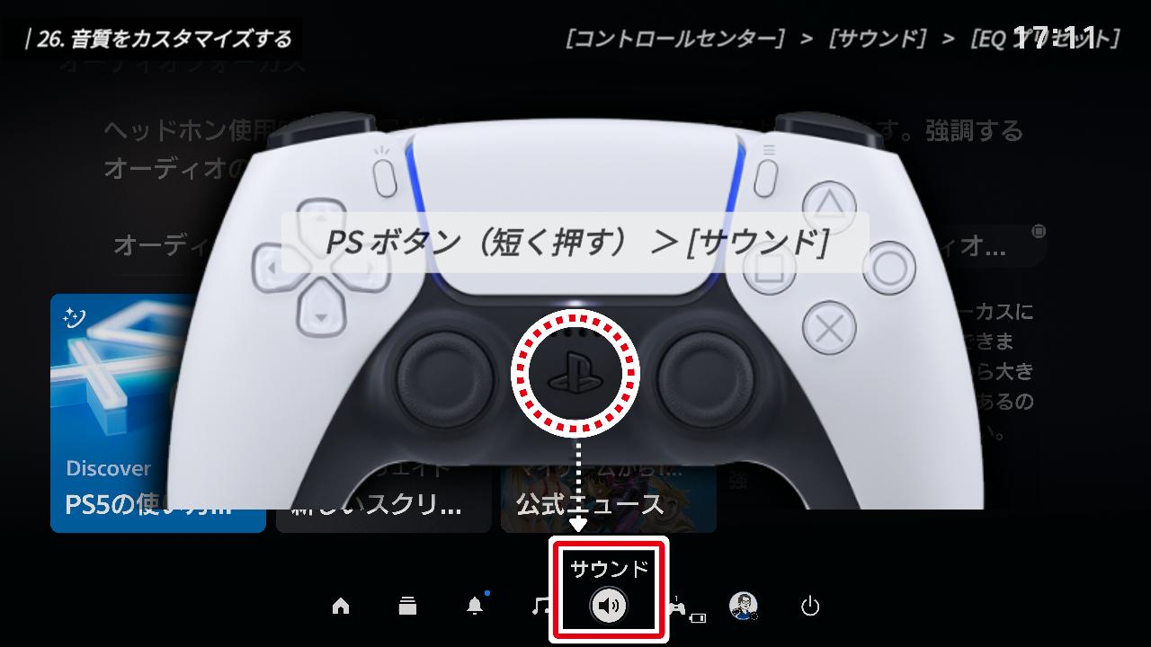 PSボタンは、長押しでホーム画面に戻りますが、短く1回 押すと画面の下にアイコンが並びます。これがコントロールメニューです。