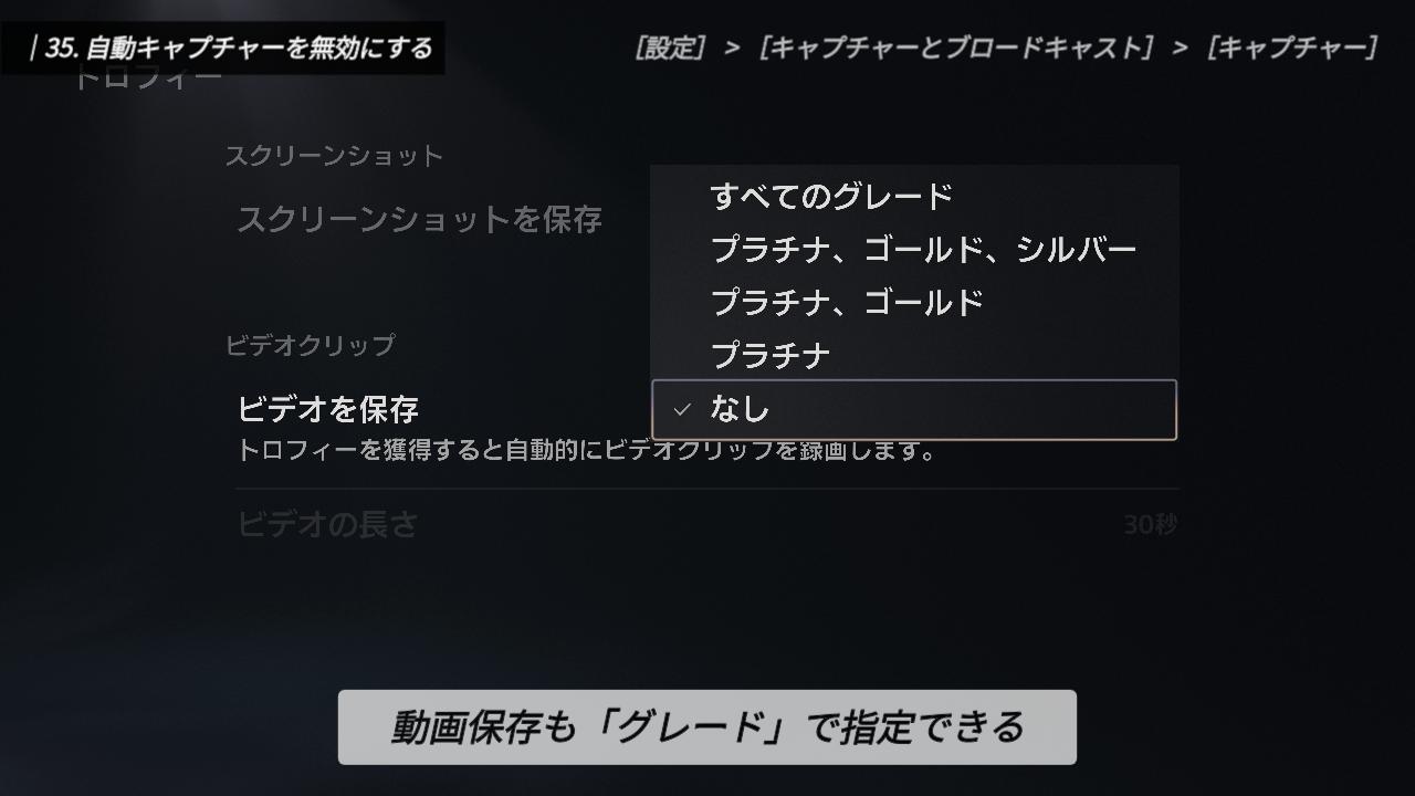 まずは「トロフィー」。トロフィーは、どのグレードを獲得したときに撮影するかを個別に選べます。私は不要なので「なし」にしていますが、トロフィーに興味がない方でも、最高ランクの「プラチナ」だけは記念にオンにしておくのもアリかもしれません。