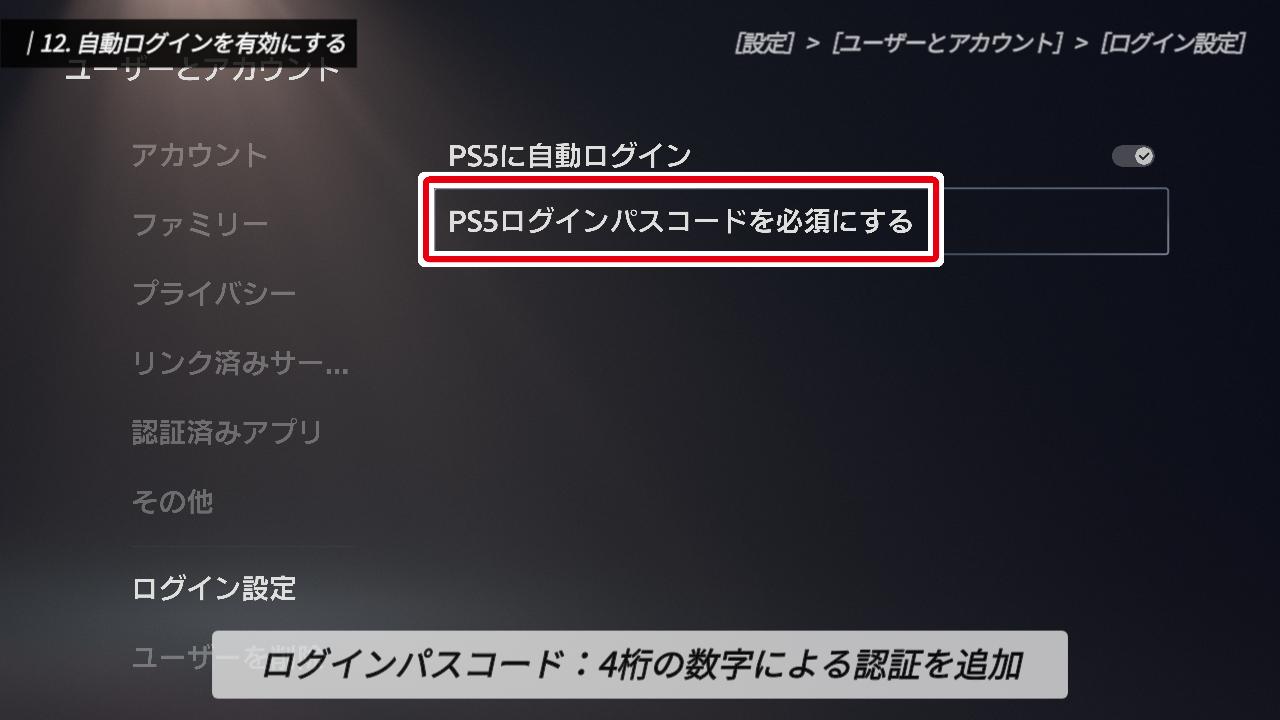 ちなみに、その下にある「PS5ログインパスコードを必須にする」を有効にすると、ログイン時に4桁の数字入力を求めることができます。「家族に自分のアカウントを勝手に触られたくない」という場合は、ここを設定しておくと安心です。私は特に制限する必要がないので、設定はオフにしています。