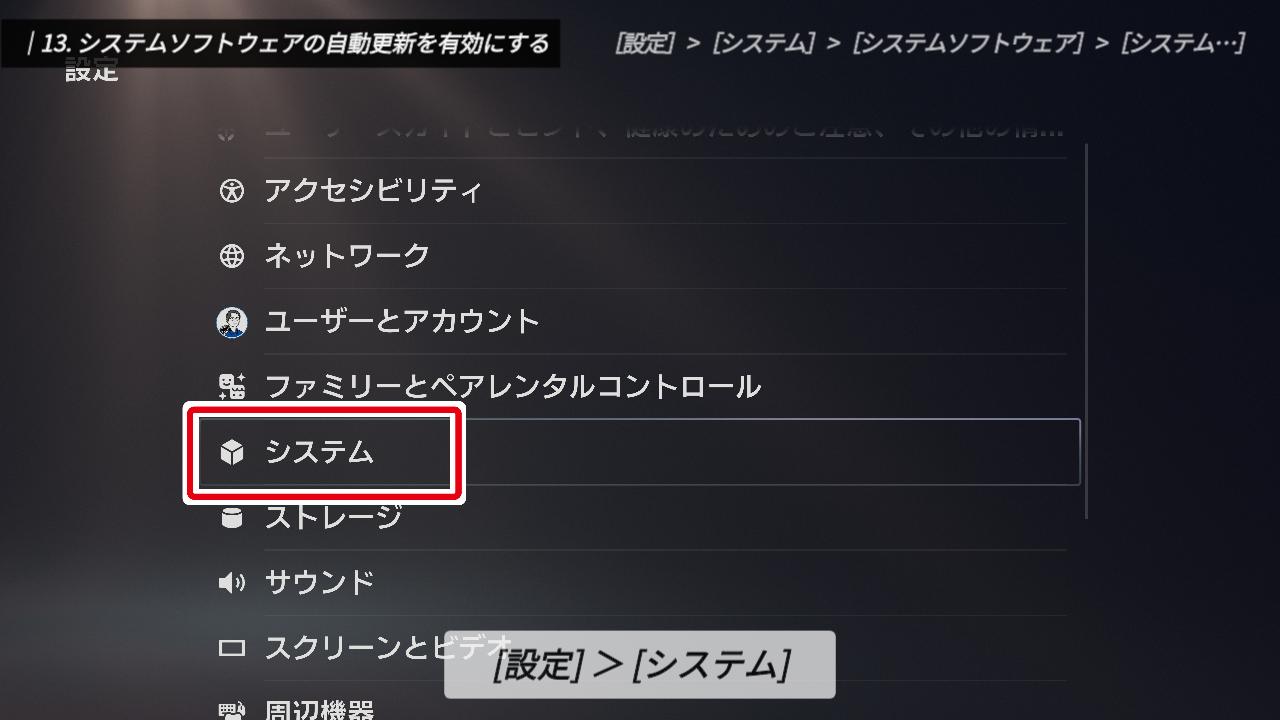 次に、設定画面を開いて、本体やコントローラー、ゲームに関する詳細な設定を行っていきましょう。