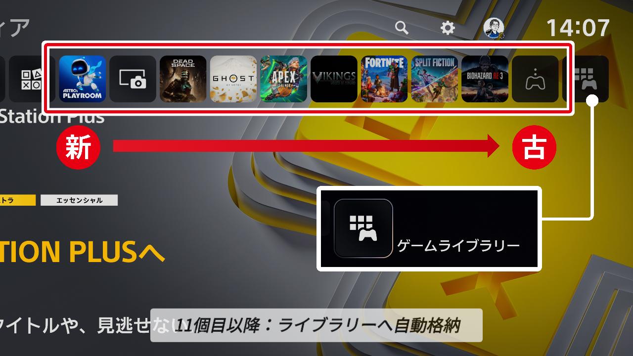 起動時に表示される「Welcomeハブ」に加え、左側の「PS Store」と「PS Plus」、そして右端の「ゲームライブラリー」。この4つは固定枠です。そのため、自由に並ぶゲームやアプリの表示枠は、実質最大10個となります。