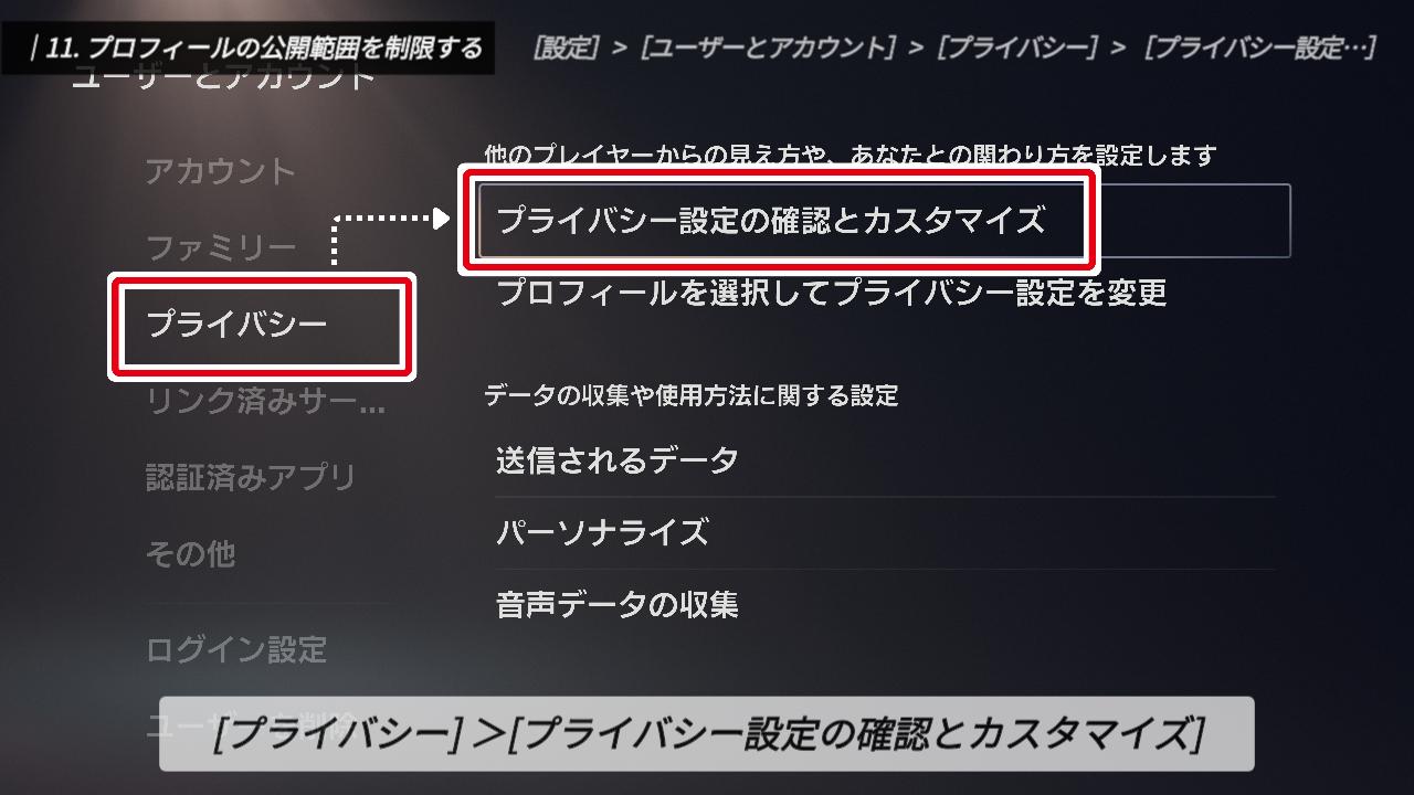 続いて、左メニューの「プライバシー」から、「プライバシー設定の確認とカスタマイズ」を開いてください。