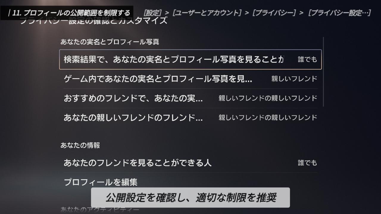 ここでは、自分の情報をどこまで他の人に見せるか、また、自分に連絡できる人を誰にするかといった制限を行うことができます。