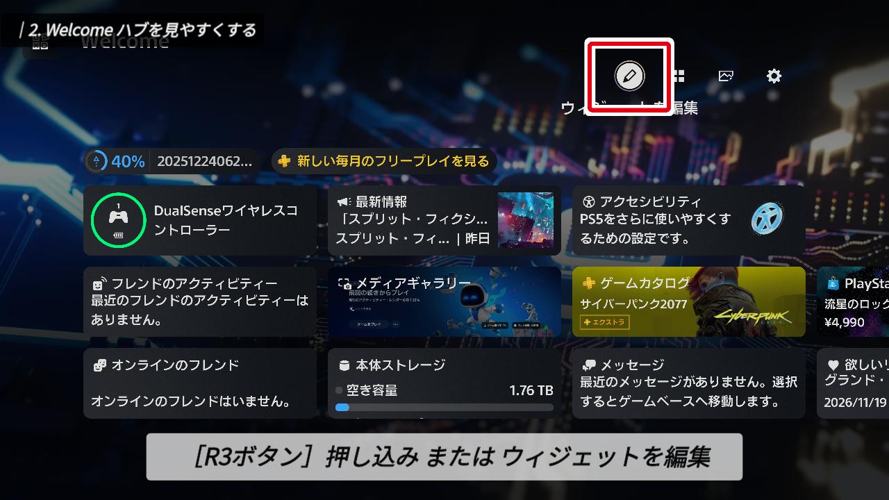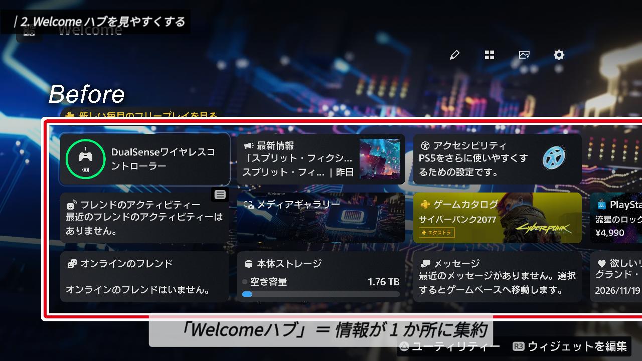 PS5を起動すると、最初に「Welcomeハブ」が表示されます。