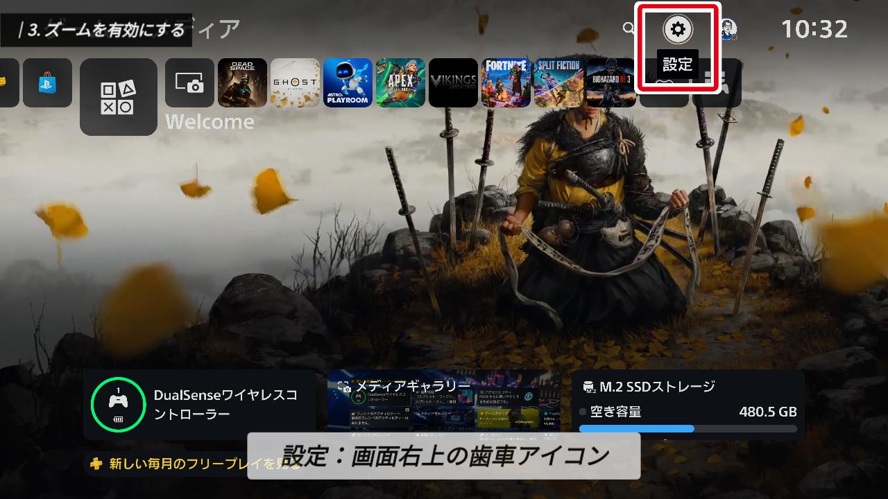PS5の設定は、画面右上の「歯車アイコン」から開くことができます。