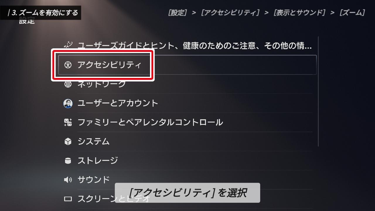 まずは、上から2番目にある「アクセシビリティ」を選択してください。