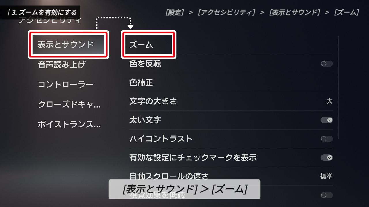 最初にご紹介するのは、「ズーム」機能です。左メニューの「表示とサウンド」から「ズーム」へと進んでください。