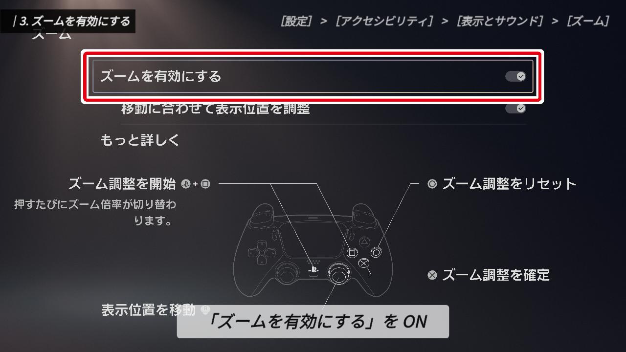 設定後は、「PSボタンと四角ボタン」を同時に押すだけで、いつでもズーム機能が使えるようになりますよ。