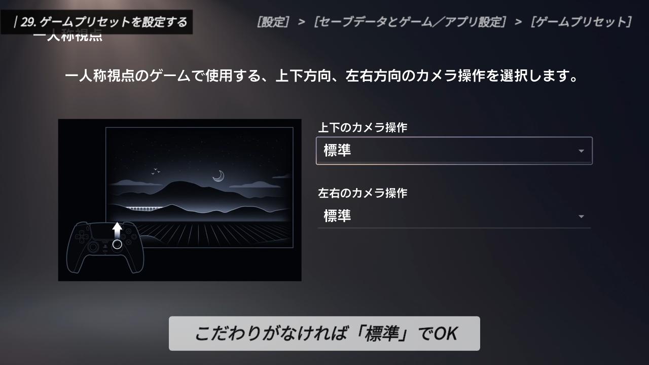 ここでは、右スティックでの視点移動を「標準」にするか「反転」にするかを選べます。「スティックを前に倒すと下を見る」という反転操作が体に染み付いている方は、ここで「反転」に設定しておけば、ゲームごとにいちいち変更しなくて済むので快適です。特にこだわりがなければ「標準」のままで問題ありません。