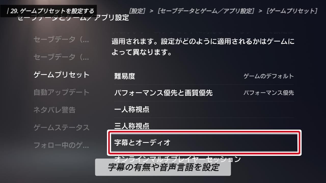 私はストーリーをしっかり把握したいので、字幕は常に「オン」にしています。音声言語については、基本は「本体言語」でOKです。もし、映画のような雰囲気で遊びたい、あるいは英語の勉強をしたいという方は「オリジナル音声」に挑戦してみるのも面白いですよ。