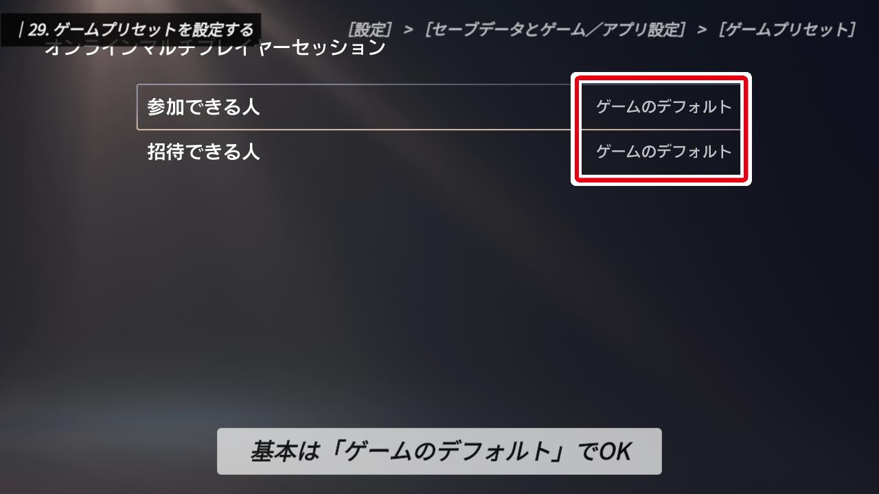 一番下の「オンラインマルチプレイヤーセッション」は、自分がホストとなって始めるオンラインプレイについて、参加や招待のルールをあらかじめ決めておく機能です。
