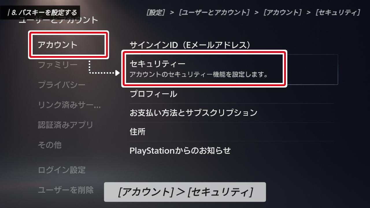 「アカウント」から「セキュリティ」へと進みましょう。