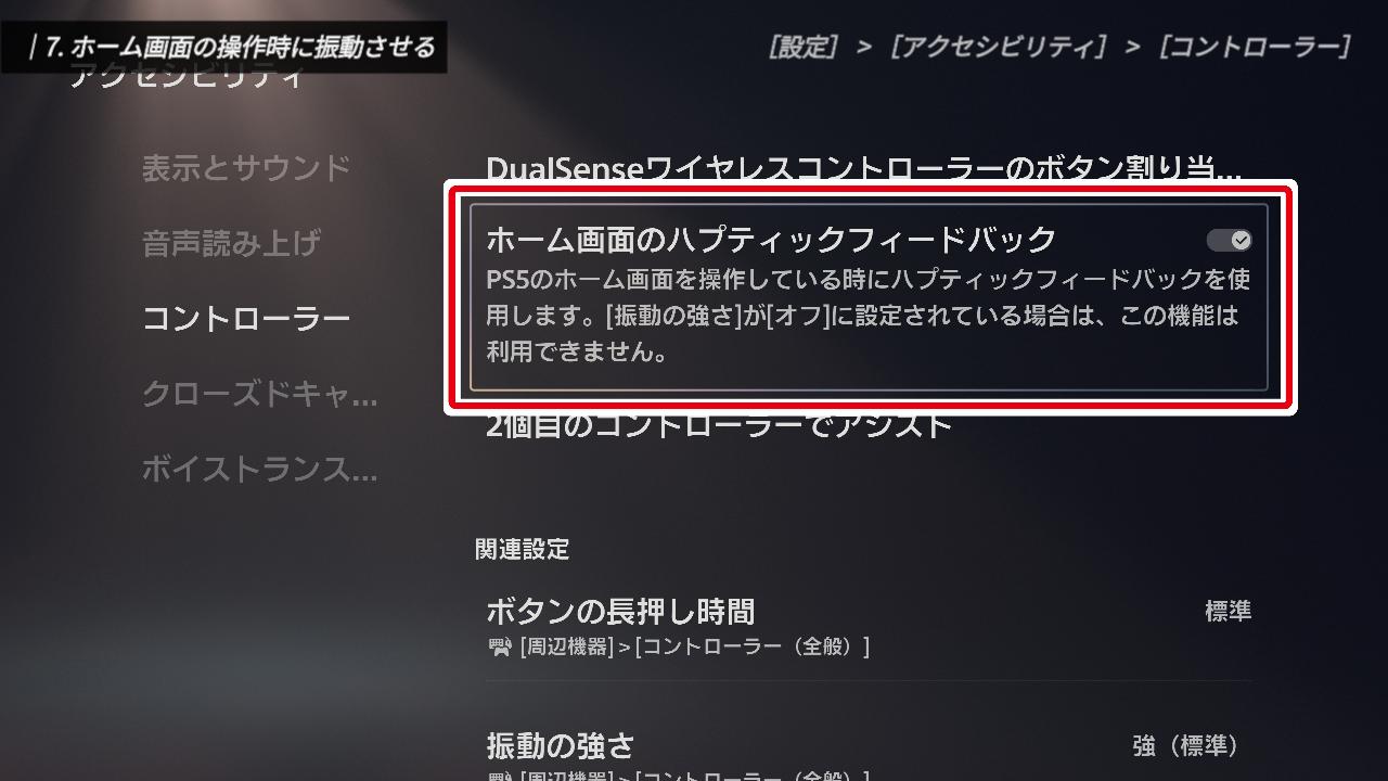 この設定を有効にすると、ホーム画面でカーソルを移動した際に、その動きに合わせてコントローラーから繊細な振動が伝わるようになります。