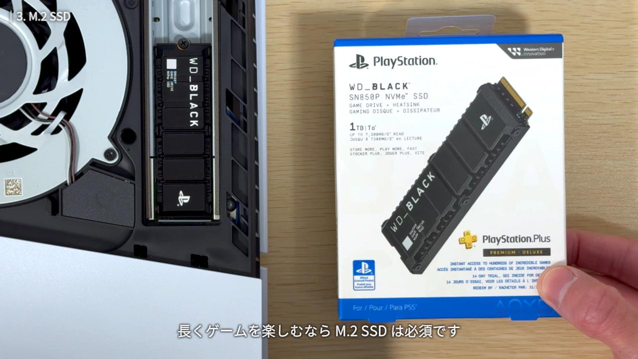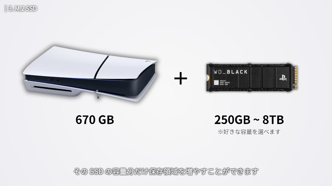 M.2 SSD を取り付ければ、本体の 670 GB に加えて、その SSD の容量分だけ保存領域を増やすことができます。要するに、ゲームソフトをたくさん保存できるようになる、ということです。容量不足でソフトを削除したり再インストールしたりする手間がなくなるのです。