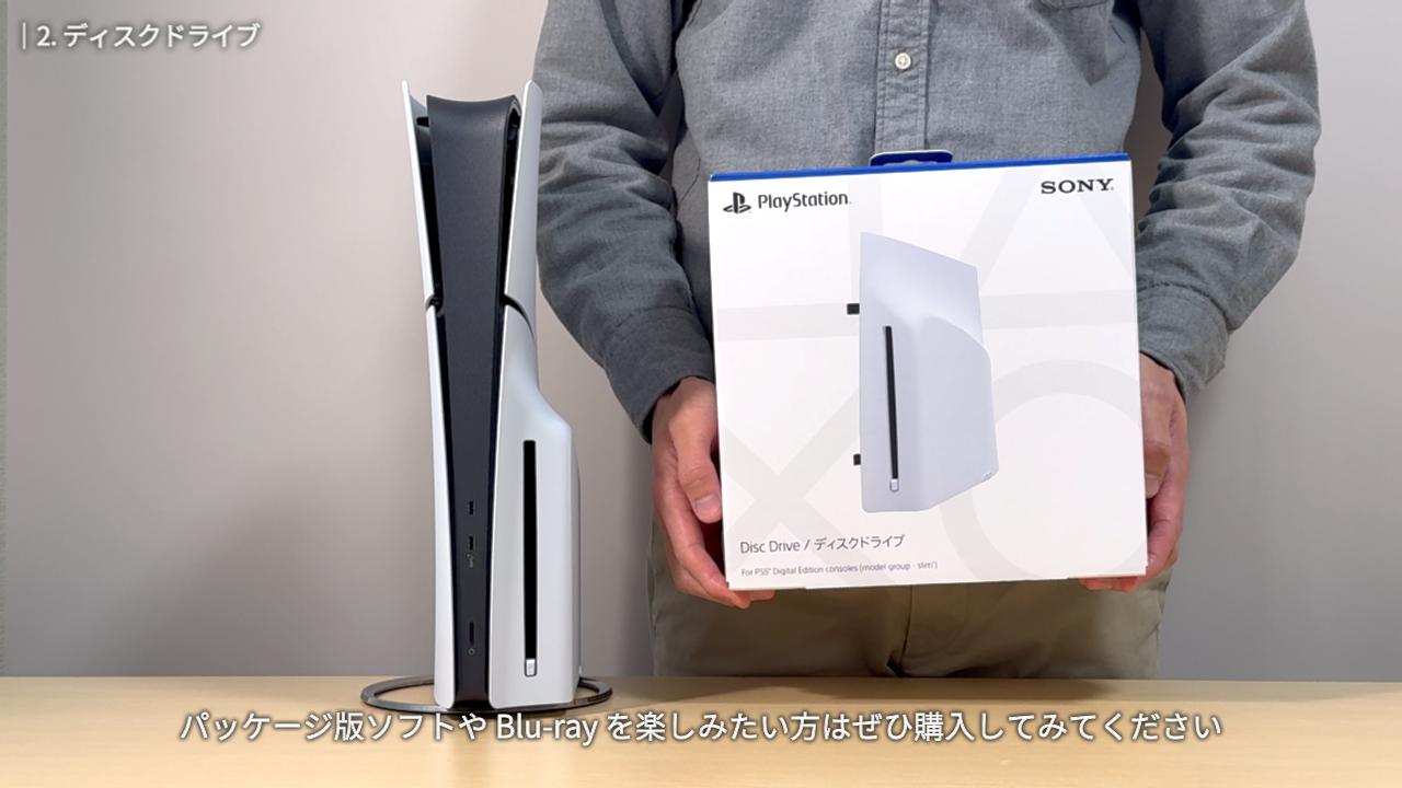 日本語専用モデルにはディスクドライブが標準搭載されていないので、パッケージ版ソフトを遊んだり、Blu-ray を再生したい場合は、別売りのディスクドライブが必要となります。