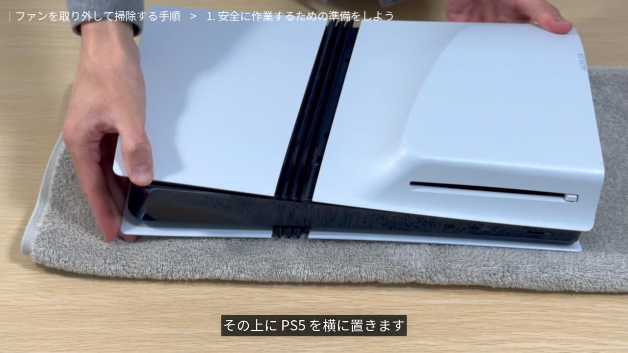 広めのテーブルにタオルなどのやわらかい布を敷き、その上に PS5 を横に置きます。